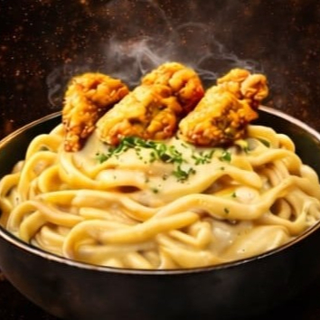 Deliciosa pasta Alfredo acompañada de crujientes tiras de pollo.
