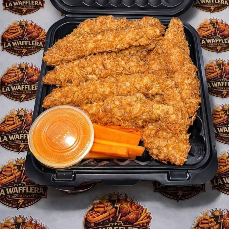 Orden de 8 tenders de pollo, incluyen aderezo chipotle y bastones de zanahoria y pepino.