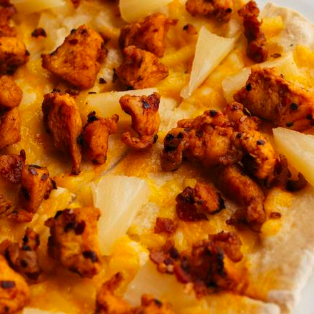 Masa crujiente cubierta con salsa alfredo y queso fundido, coronado con pollo crispy, bañado en salsa red hot, trocitos de piña, cebolla morada fresca, cilantro y un toque cremoso de aderezo ranch lapa.