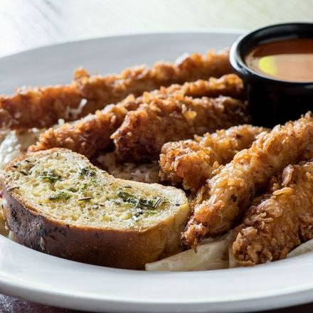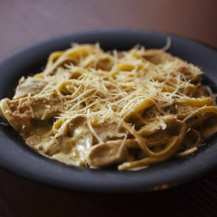 Fettuccine bañado en una cremosa salsa Alfredo hecha con mantequilla, crema ácida y queso parmesano, coronado con tiras de pollo empanizado y crujiente.