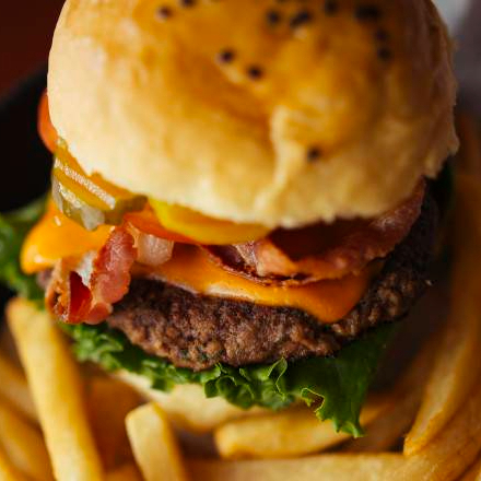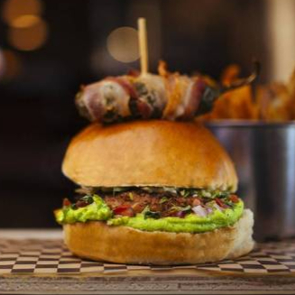 Carne de res choice 80/20 a la parrilla, servida en pan brioche casero con queso fundido, guacamole, pico de gallo y aderezo de chile xcatic, coronada con un chile jalapeño relleno de dip de espinaca envuelto en tocino. Papas de su elección.