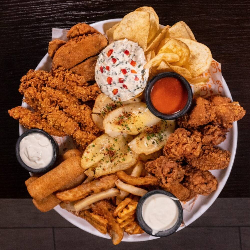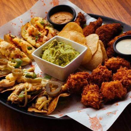 Para matar el hambre tenemos una deliciosa combinación de 6 pzs de alitas, boneless naturales, 2 mitades de cáscaras de papa búfalo, nachos bite, guacamole y hojuelas de papa. Acompañado de aderezo Ranch y mayonesa Cajún.