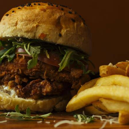 Una deliciosa hamburguesa de pechuga empanizada crispy con salsa Red Hot, servida con pan brioche. Acompañada de col morada, zanahoria rallada, lechuga fresca, jugoso tomate, salsa alfredo cremosa y un toque de cebollin.