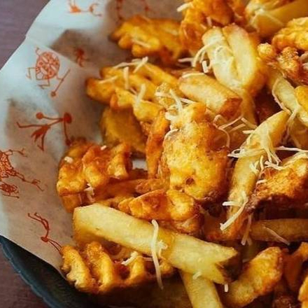 Combinación de papas a la francesa, papas gajo y crisscut, acompañado de queso cheddar y espolvoreado con queso parmesano.