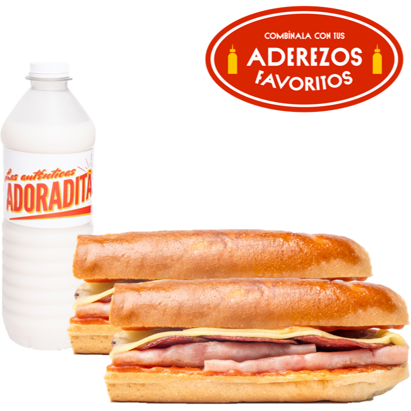 ¡La especialidad! nuestra deliciosa adoradita con jamón pechuga de pavo, salami, queso manchego o daysi y aderezo de la casa.