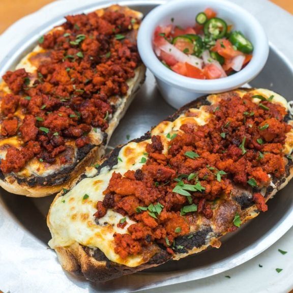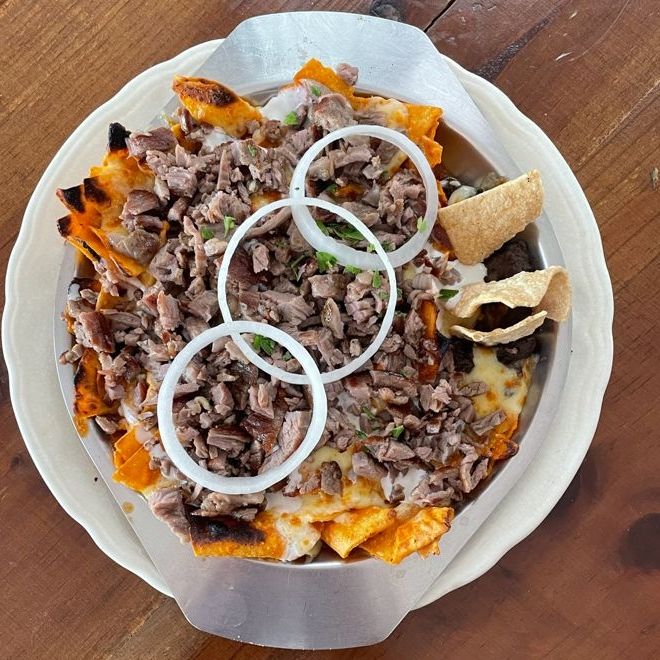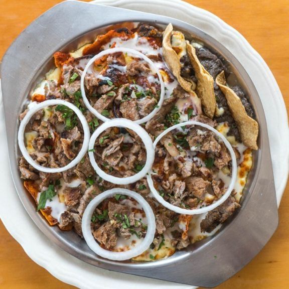 Salsa de guajillo, carne asada y queso gratinado.