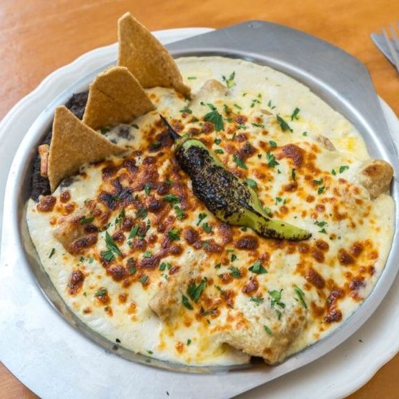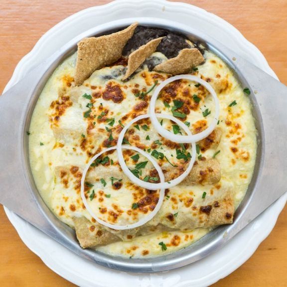 4 Piezas rellenas de pollo, bañadas en salsa verde cremosa y gratinadas. Se sirven con frijol y totopos.