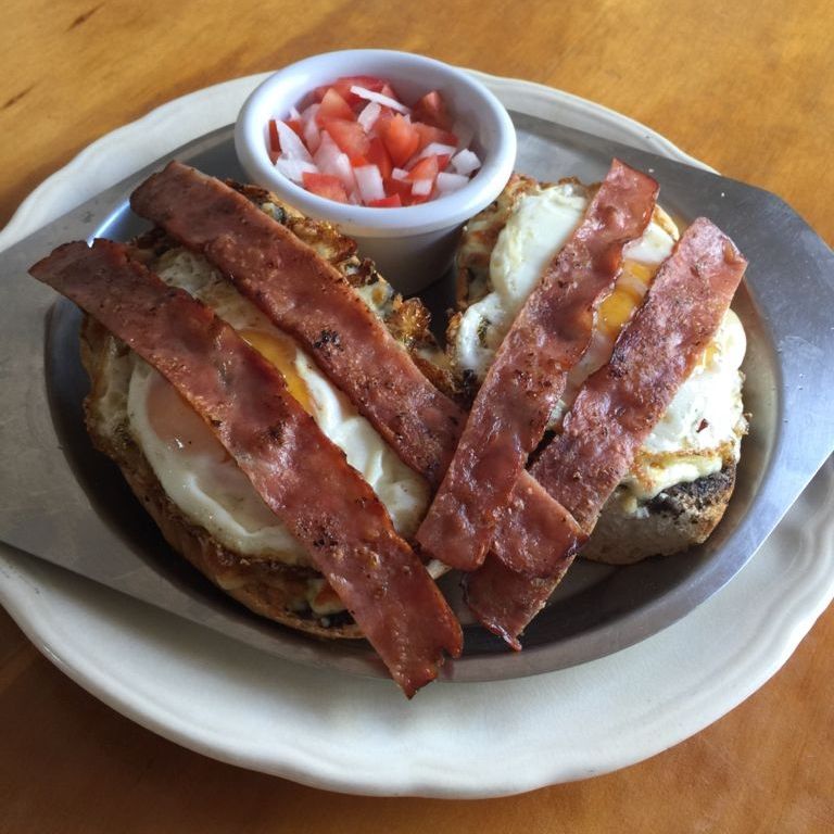 Frijol, tiras de tocino, dos huevos estrellados y queso gratinado, acompañados con pico de gallo.