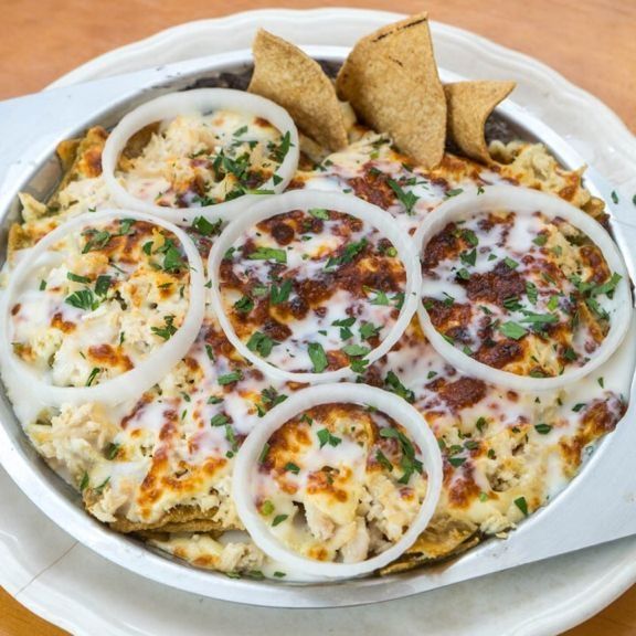 Deliciosos chilaquiles con salsa cremosa verde, queso gratinado y pechuga de pollo desmenuzado.