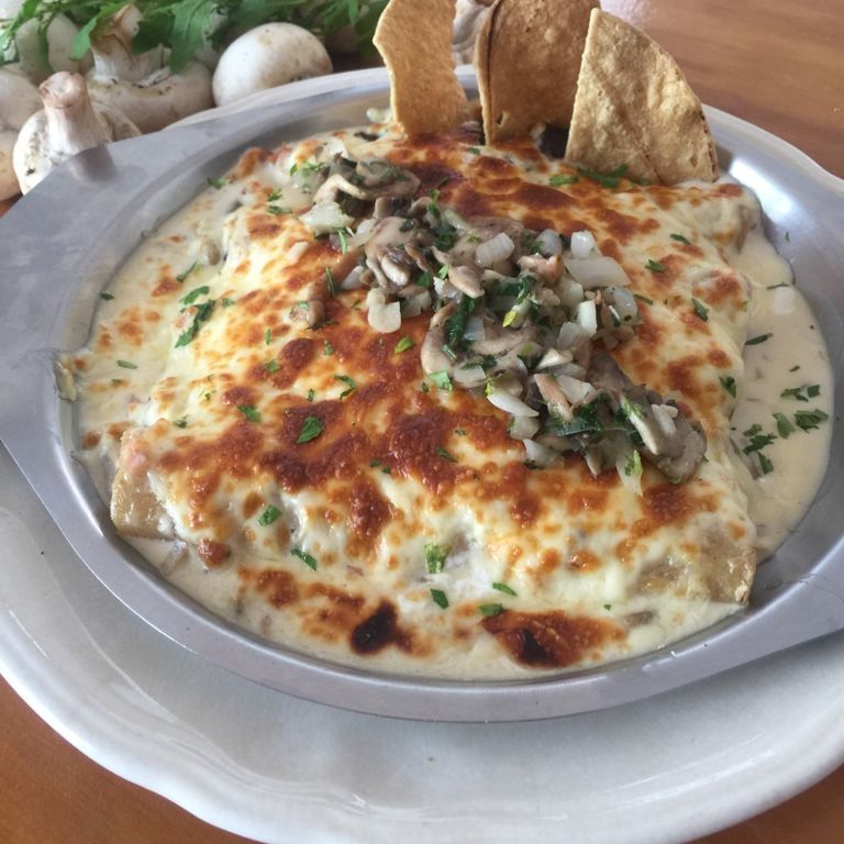 4 Piezas rellenas de pollo, bañadas en crema de champiñones y gratinadas. Se sirven con frijol y totopos.