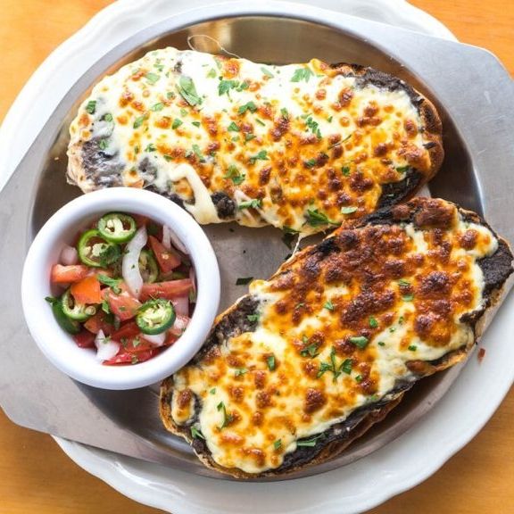 Frijol y queso gratinado, acompañados con pico de gallo.