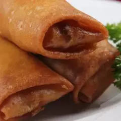 2 rollos primavera rellenos de verdura (repollo, zanahoria, apio y cebolla) y pollo picado (50 a 60 g) incluye salsas (porción personal).
