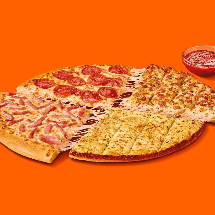 Pizza grande de cuatro sabores, mitad pizza de pepperoni y de jamón, y mitad stix de queso y de tocino. Acompañados de una crazy sauce