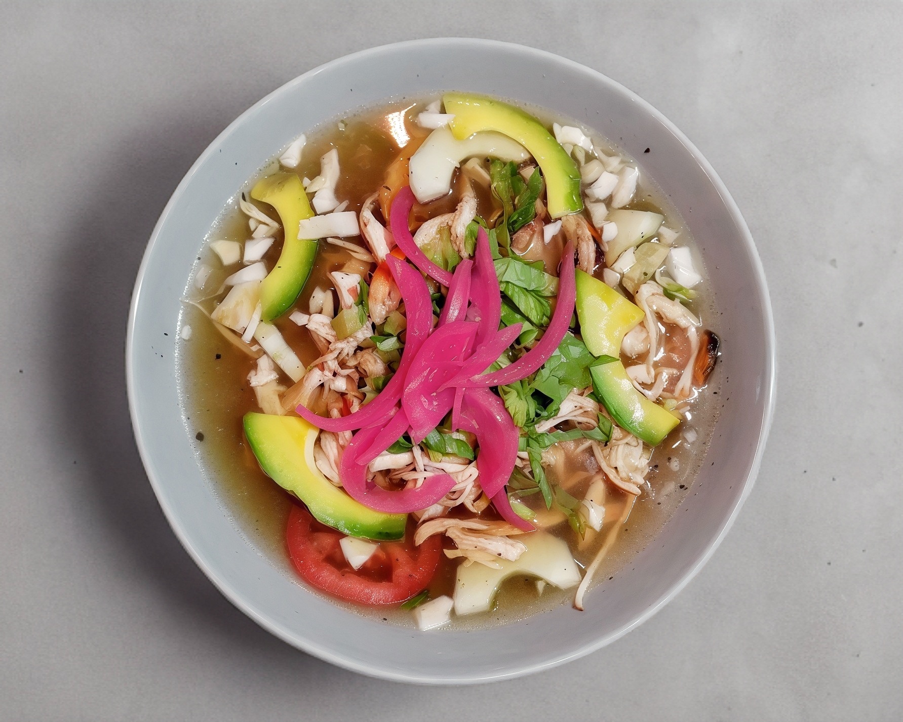 Consomé de pollo calientito acompañado con tostada hecha de maiz(bajo disponibilidad), carne de pollo, repollo, pepino blanco, lechuga italiana, aguacate en rajas y tomate en rodajas. Servido en recipiente de 1lt. 60gr de carne aprox.