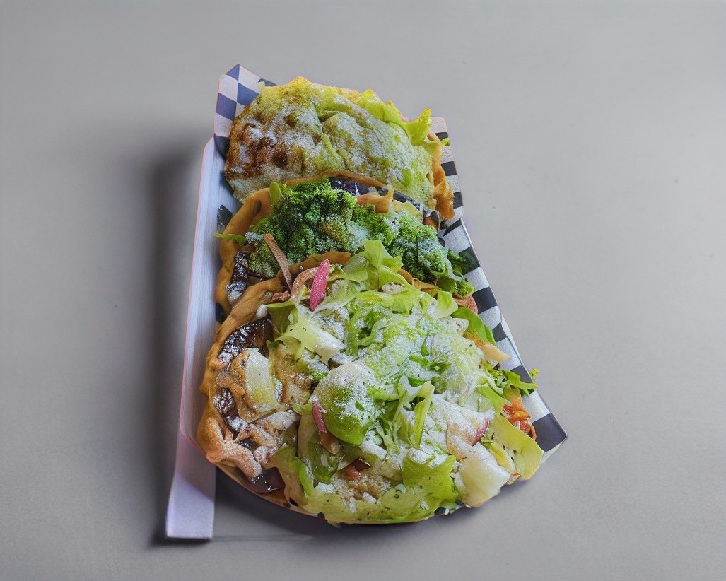 Tortilla hecha de masa debidamente frita acompañada de lechuga italiana, repollo picado, guiso a elegir, aguacate, pepino, cebolla curtida y tomate en rodajas. (Verduras pueden variar según el guiso seleccionado).
