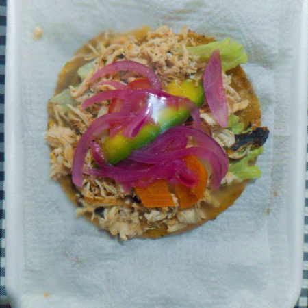 Tortilla hecha de masa debidamente frita acompañada de lechuga italiana, repollo picado, carne molida de cerdo, pepino, agucate, cebolla curtida y tomate frito.