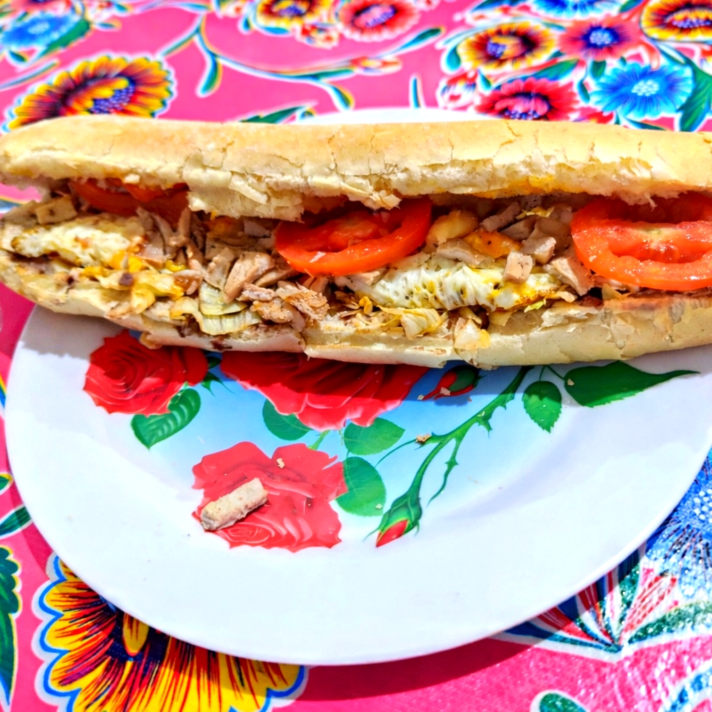 Bolillo, huevo, chorizo, lechuga, tomate, cebolla y aguacate