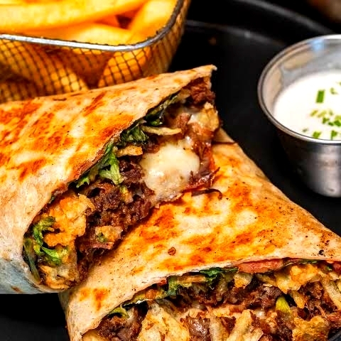 tortilla de harina xxl, carne asada, cama de frijol colado, tomate, cebolla, lechuga cortada acompañado de media crema lechuga cortada en bolsa, salsa casera y media orden de papas fritas