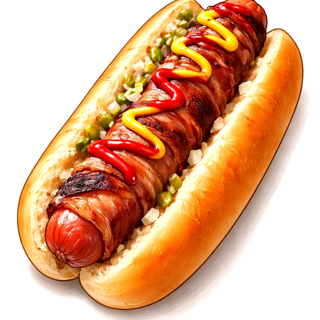 Pan para perros, salchicha de pavo, tocino , cebolla frita y aderezos de la casa