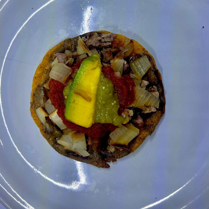 Exquisita tortilla de maíz dorada y rellena de frijol negro refrito, servida con jugosa carne asada al punto perfecto. Se acompaña de cebolla asada que realza su sabor ahumado, y se corona con salsa verde y roja, logrando un balance vibrante entre lo crujiente, lo jugoso y lo picante de la cocina regional.