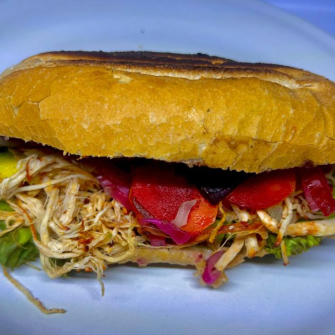 Clásico antojito mexicano preparado con un esponjoso bolillo relleno de frijoles refritos y pollo deshebrado jugoso. Se acompaña con mayonesa y una fresca combinación de lechuga, tomate, cebolla morada, remolacha, zanahoria y pepino, coronado con la suavidad del aguacate. Un bocado abundante, colorido y lleno de sabor que celebra lo auténtico de la cocina casera.