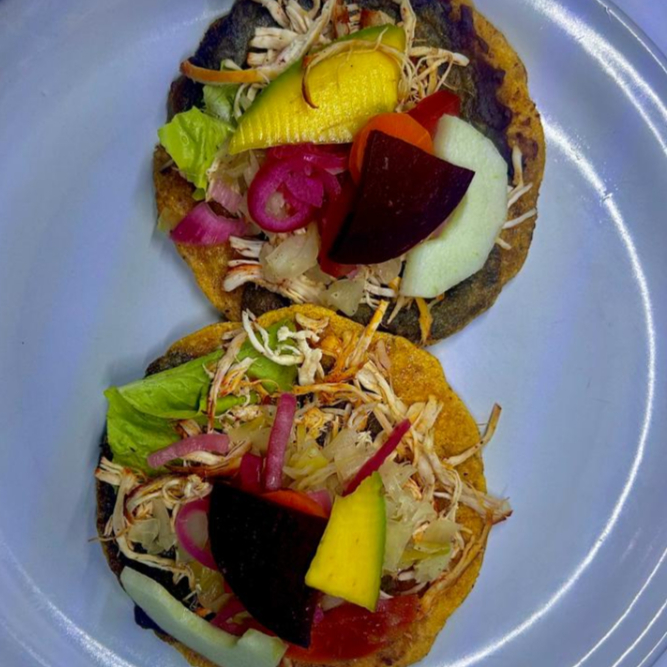 Tradicional antojito yucateco elaborado con tortilla de maíz frita y rellena de frijol negro refrito. Coronada con jugoso carne pollo deshebrado, fresca lechuga, rodajas de tomate, cebolla morada, repollo, rodaja de remolacha, zanahoria, pepino acompañado de un toque de aguacate. Una combinación que equilibra lo crujiente, lo fresco y lo auténtico de la cocina regional.