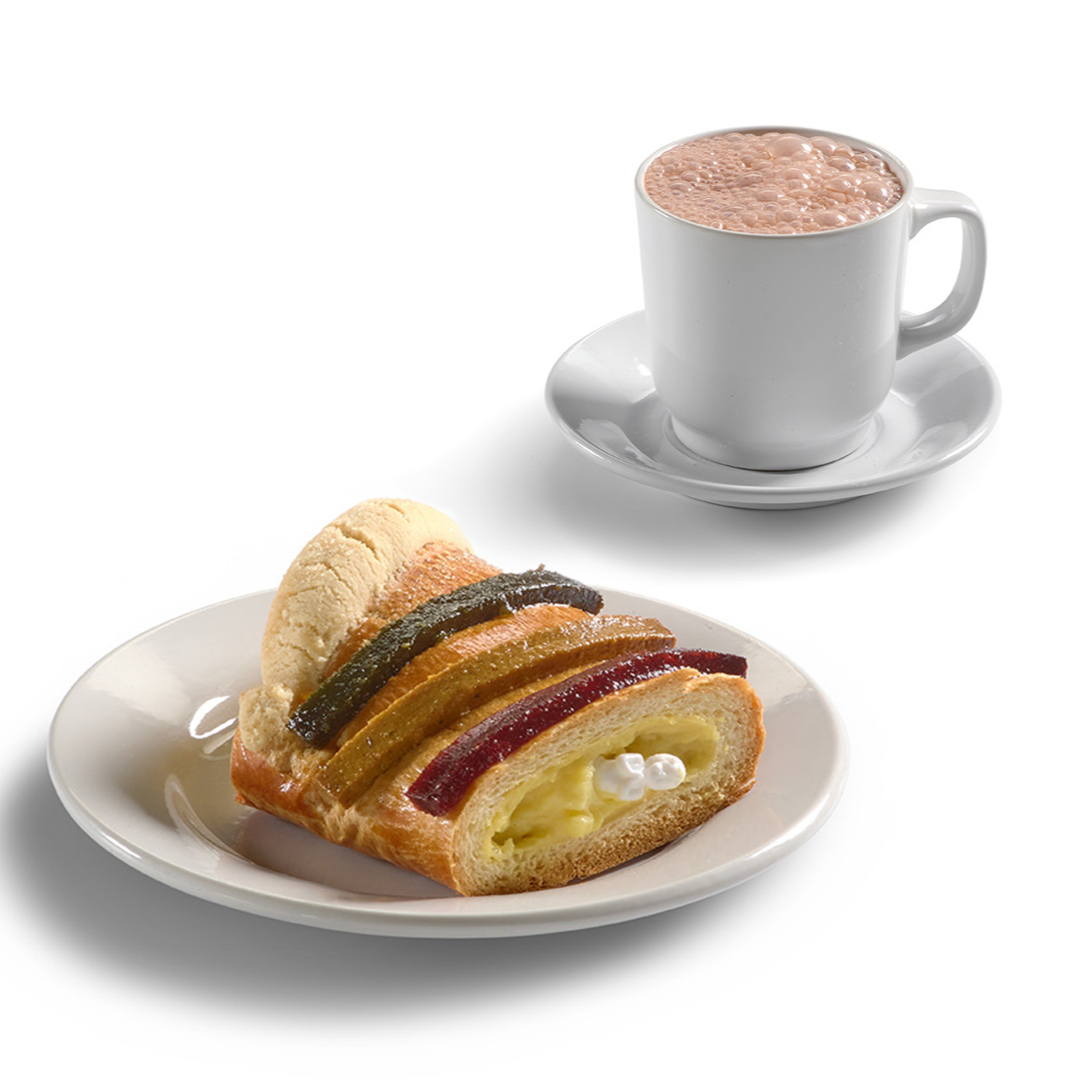 Rebanada de rosca de reyes rellena de crema pastelera (140g) más bebida a tu eleccion (café con leche, chocolate ó capuchino)