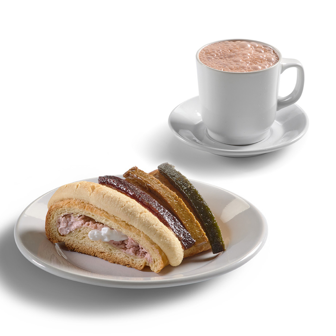 Rebanada de rosca de reyes rellena de queso crema y mermelada de zarzamora (140g) más bebida a tu eleccion (café con leche, chocolate ó capuchino)