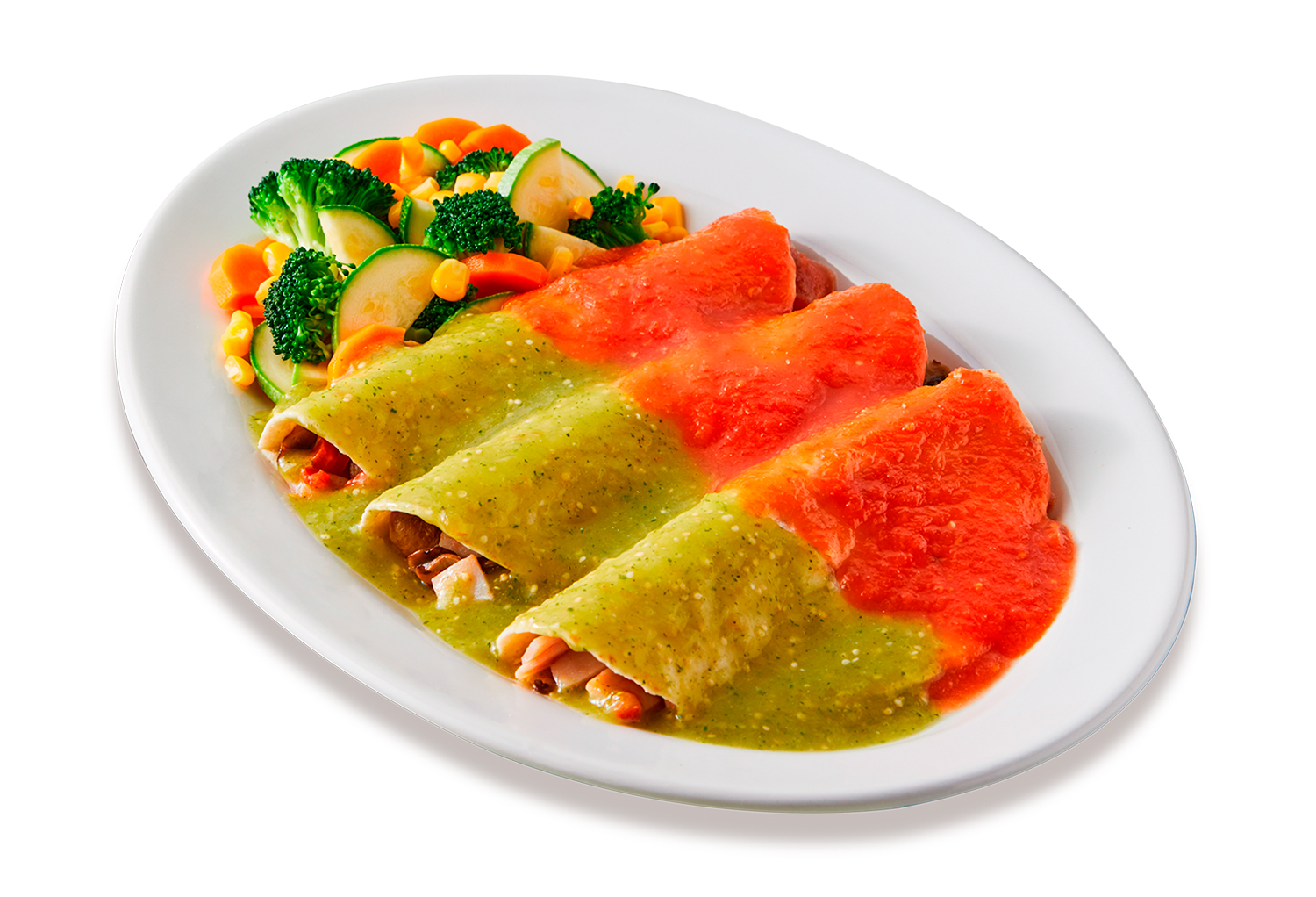 Tortillas de harina rellenas de jamón de pavo con champiñón y jitomate, bañadas de salsa ranchera y salsa verde con cilantro. Incluye 1 bolillo por platillo
