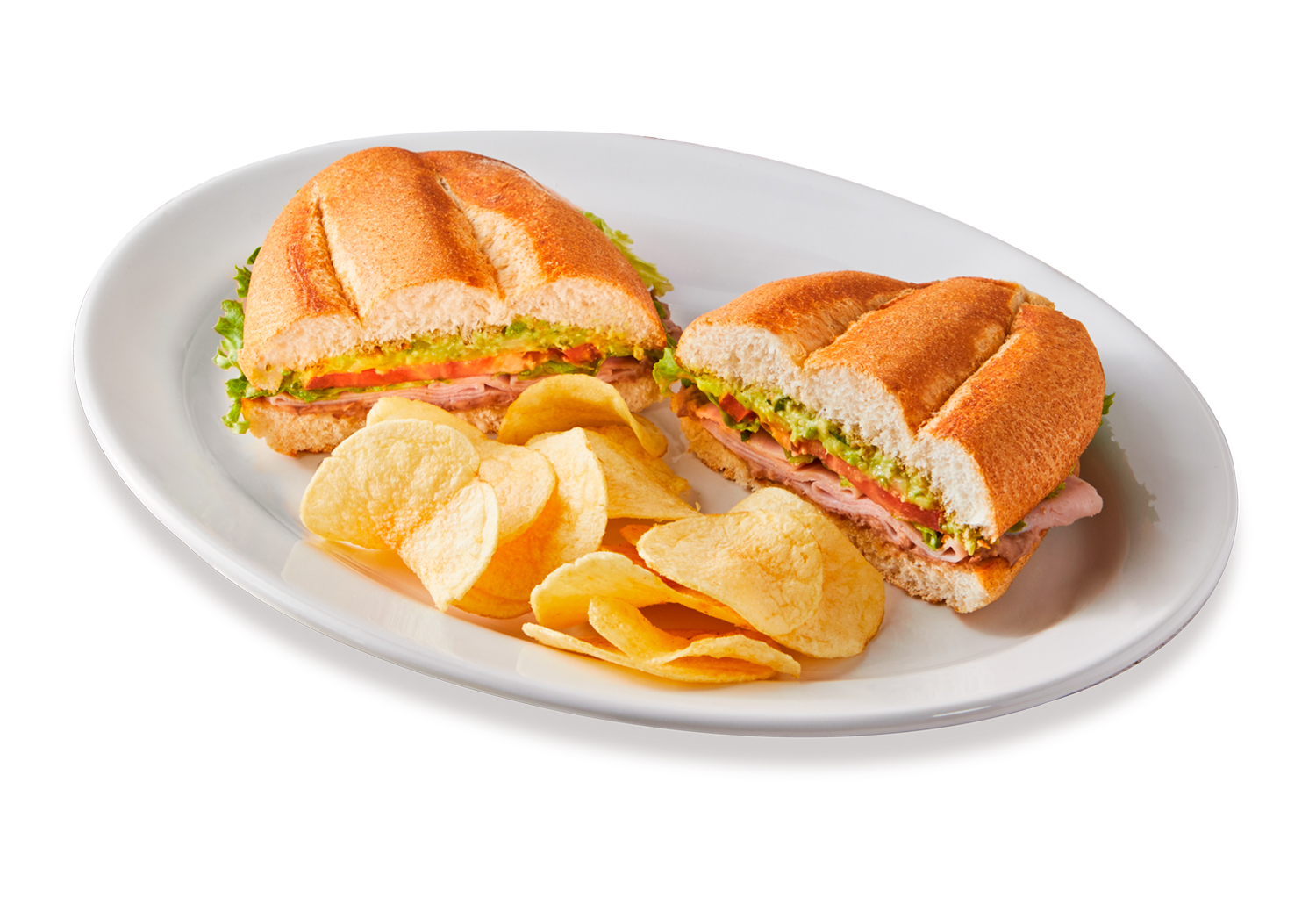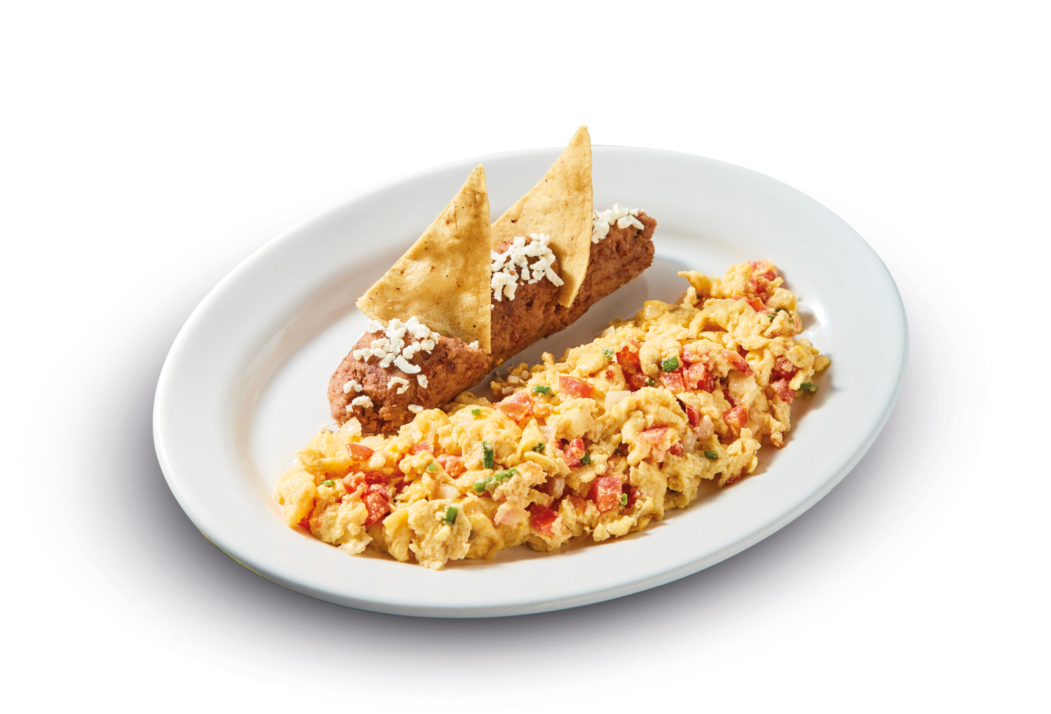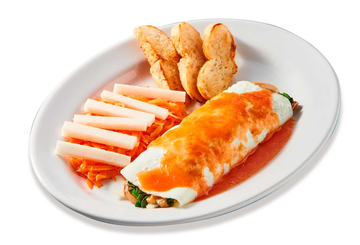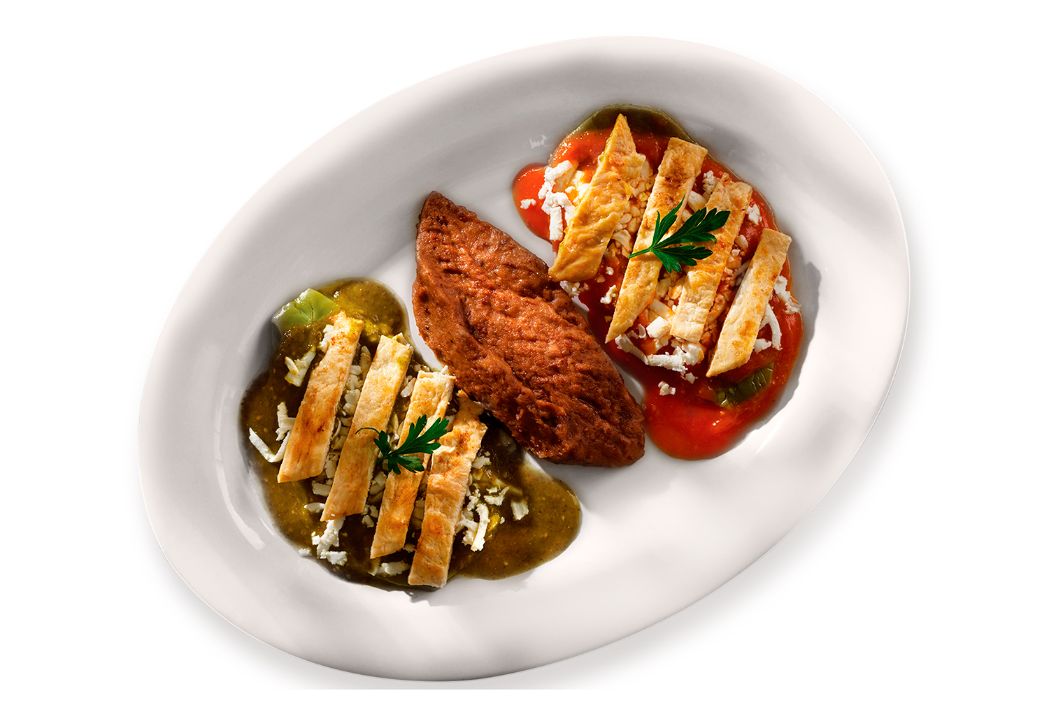 Tortillas de harina rellenas de jamón de pavo con champiñón y jitomate, bañadas de salsa ranchera y salsa verde con cilantro. Incluye 1 bolillo por platillo
