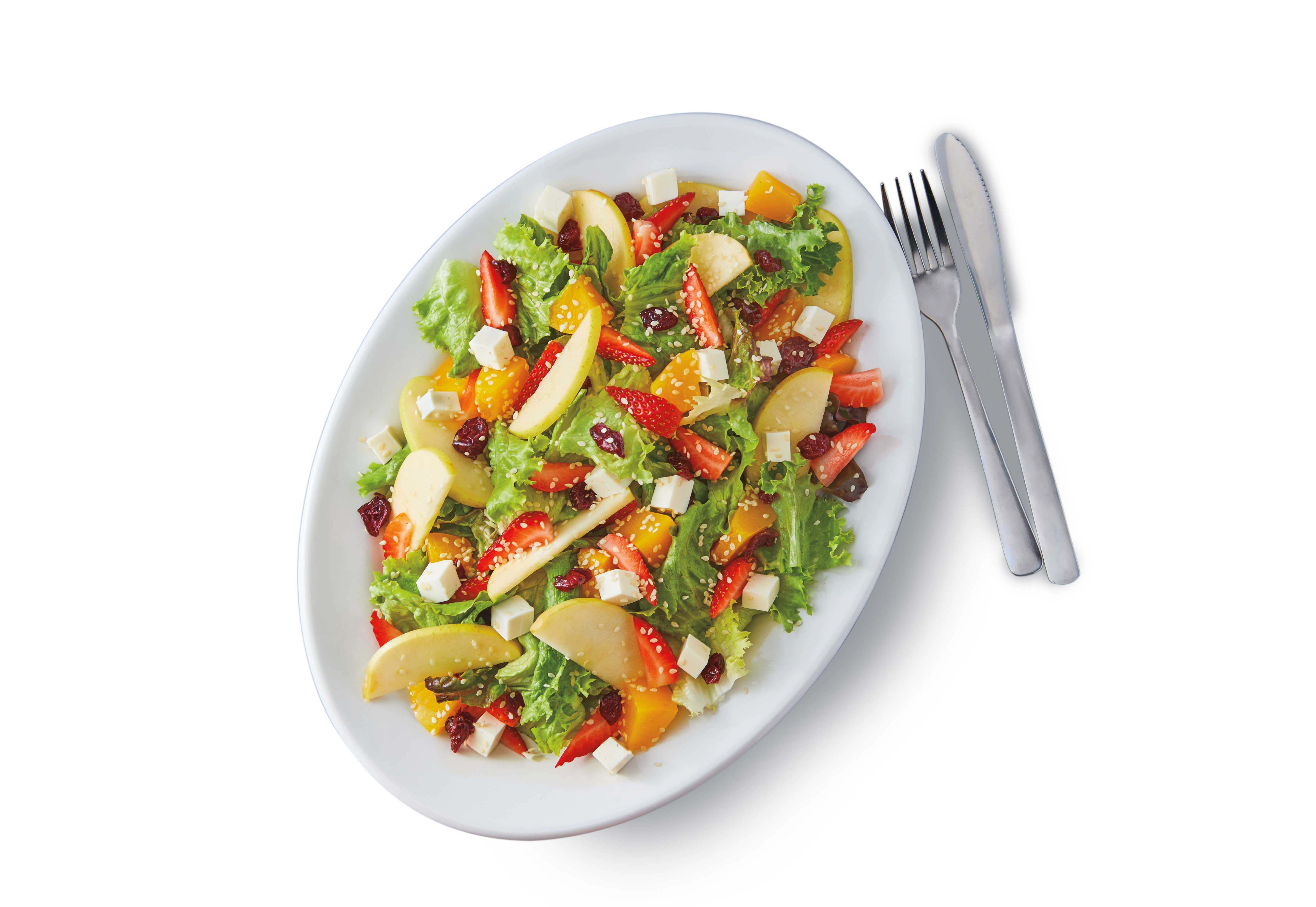 Rica combinación de lechugas acompañadas de manzana, arándano, queso panela, fresa y un toque dulce de durazno y ajonjolí tostado.