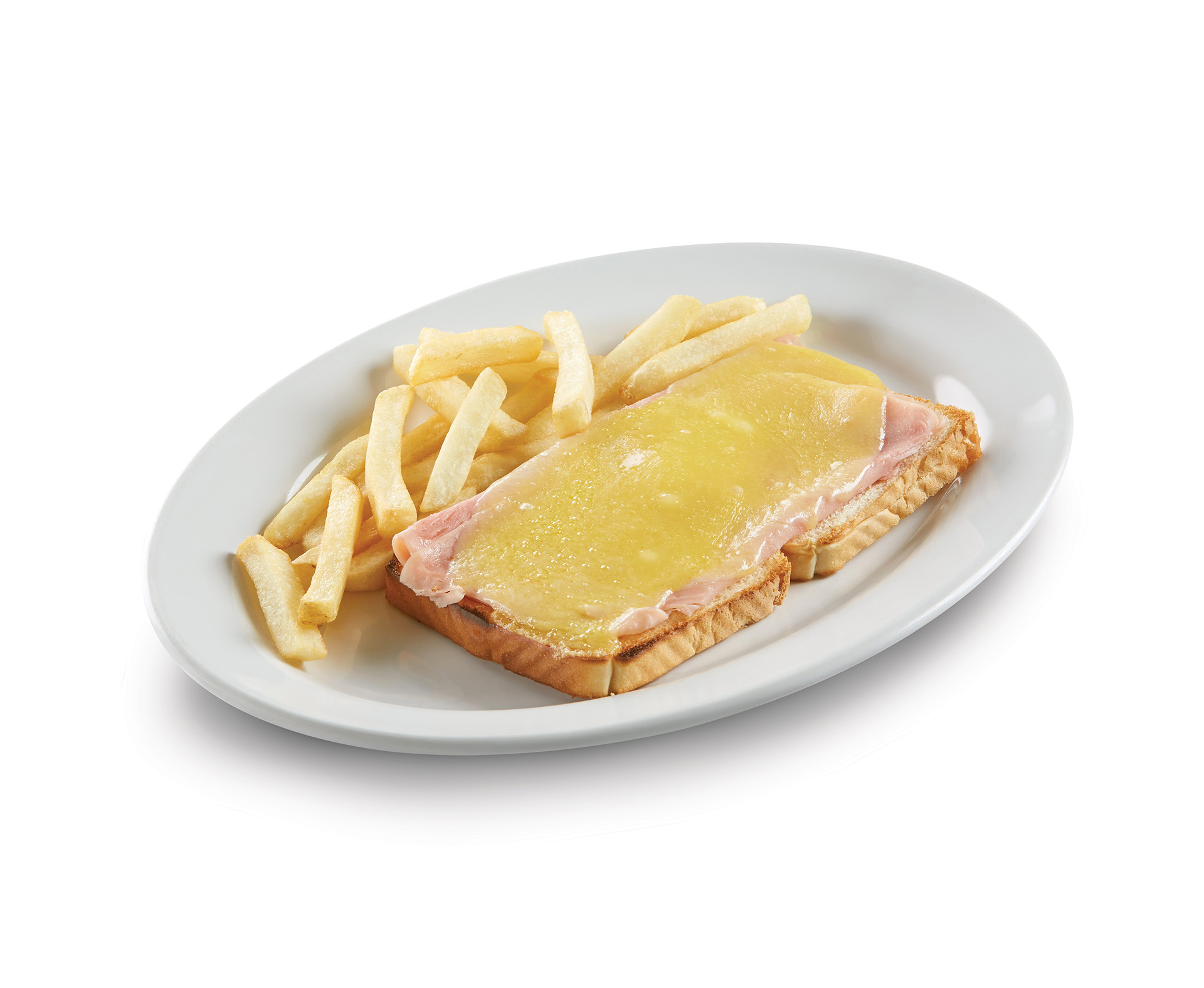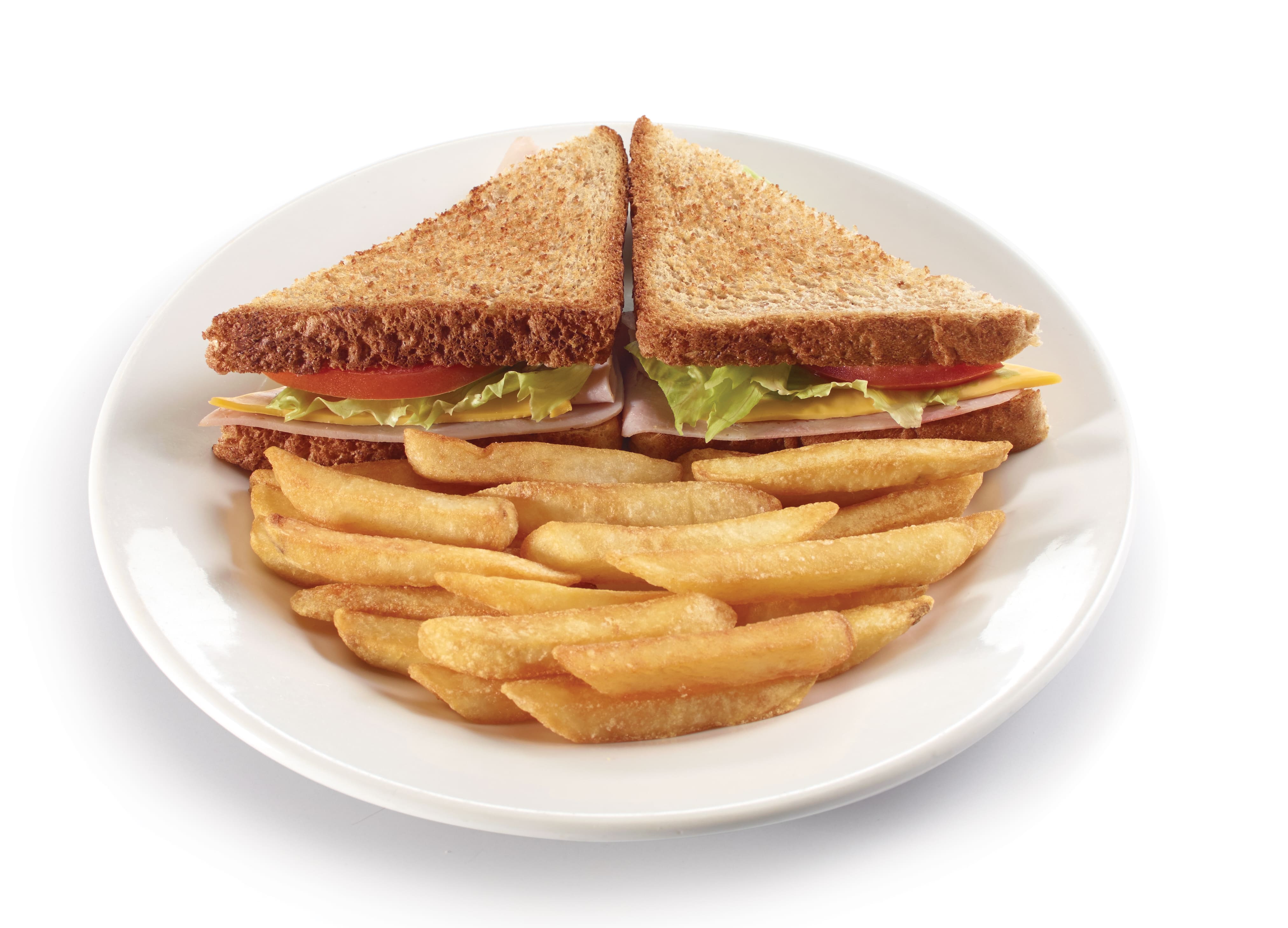 Sándwich de pan integral con queso amarillo, jamón, lechuga y jitomate, decorado con papas a la francesa. (Incluye consomé de pollo infantil 300 ml.