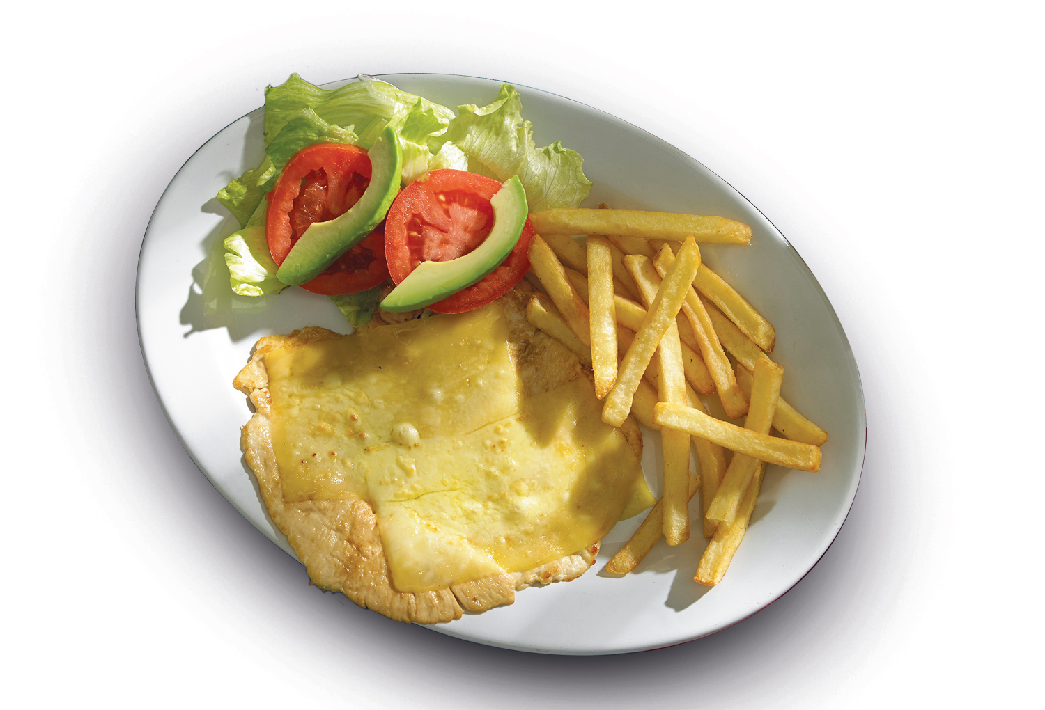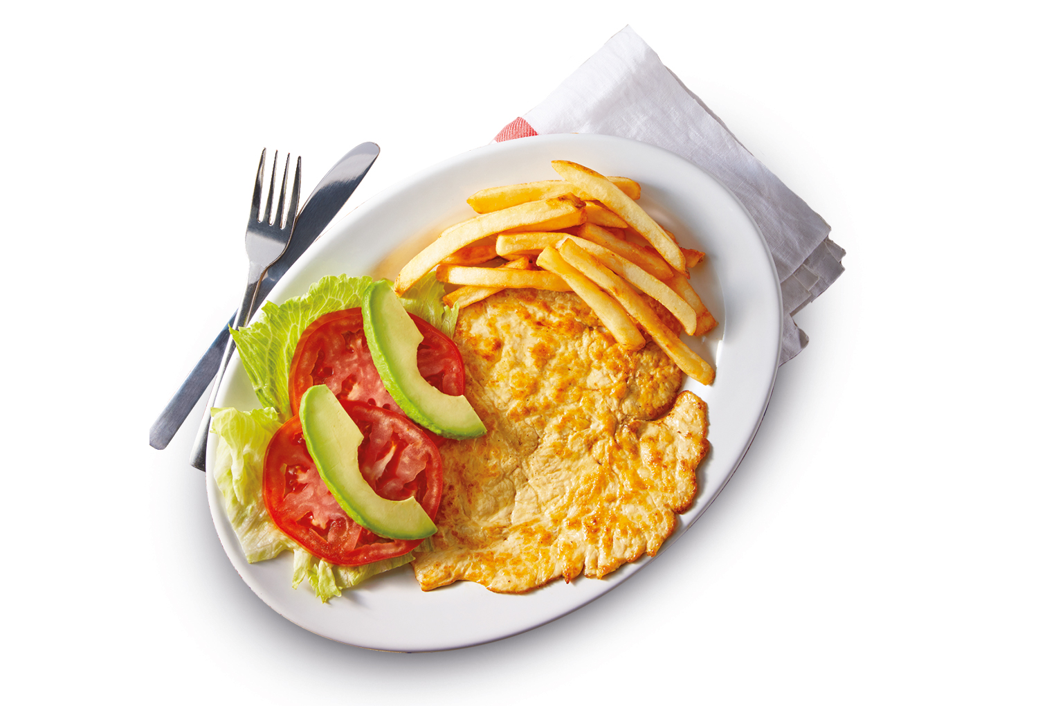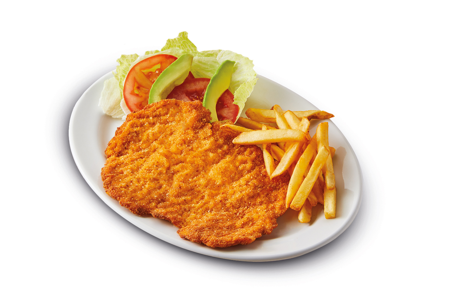 Sábana de pollo empanizada, acompañada de papas saratoga. Incluye consomé de pollo infantil 300 ml. Incluye 1 bolillo por platillo
