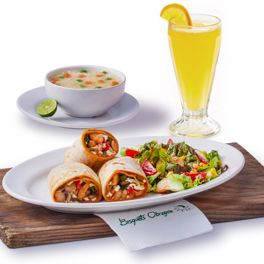 Burrito de mariscos con queso oaxaca (camarón y pescado) acompañado de ensalada mixta con aderezo de jamaica.