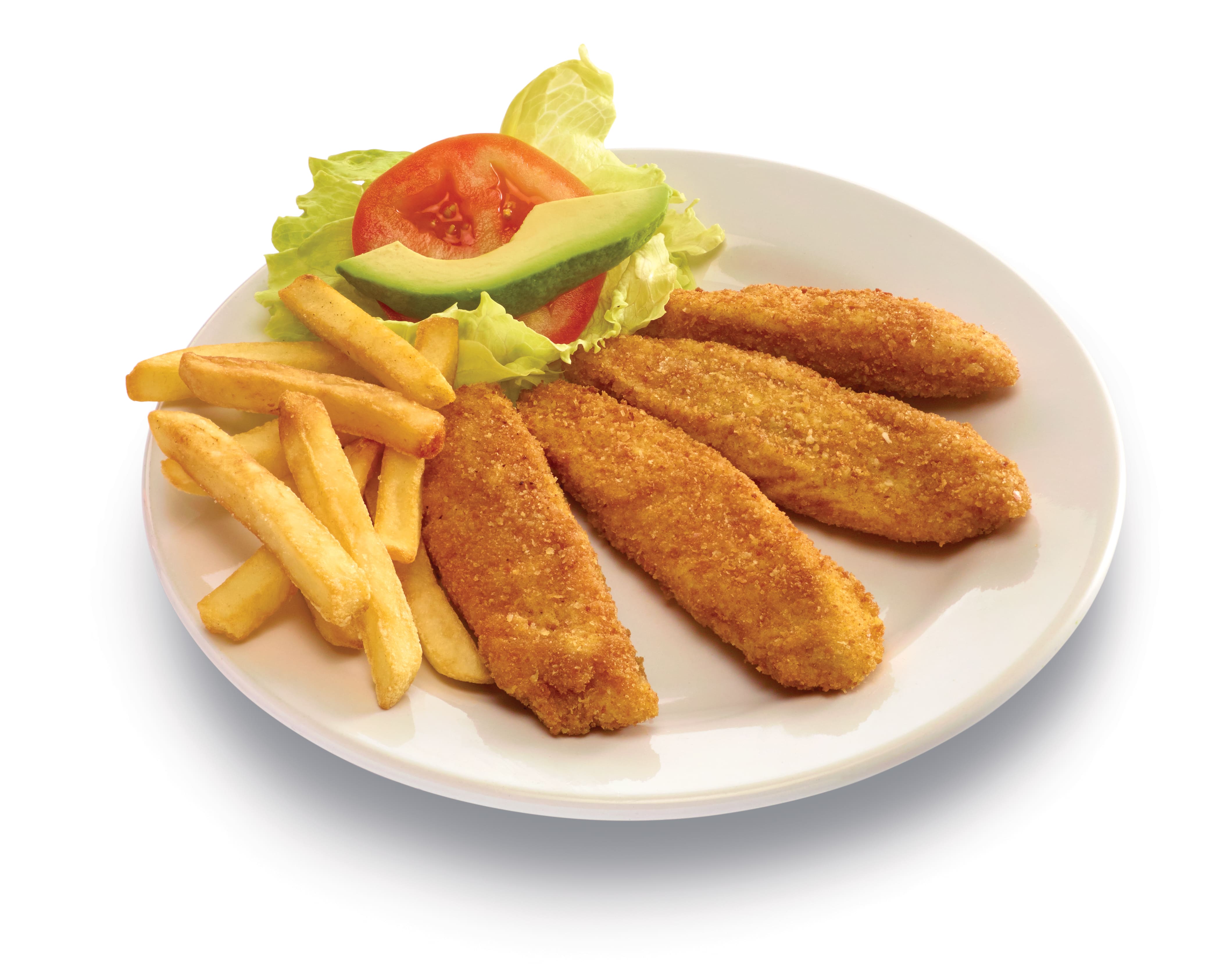 Trocitos de pechuga empanizada, decorados con papas a la francesa, lechuga, jitomate y aguacate. Incluye consomé de pollo infantil 300 ml.