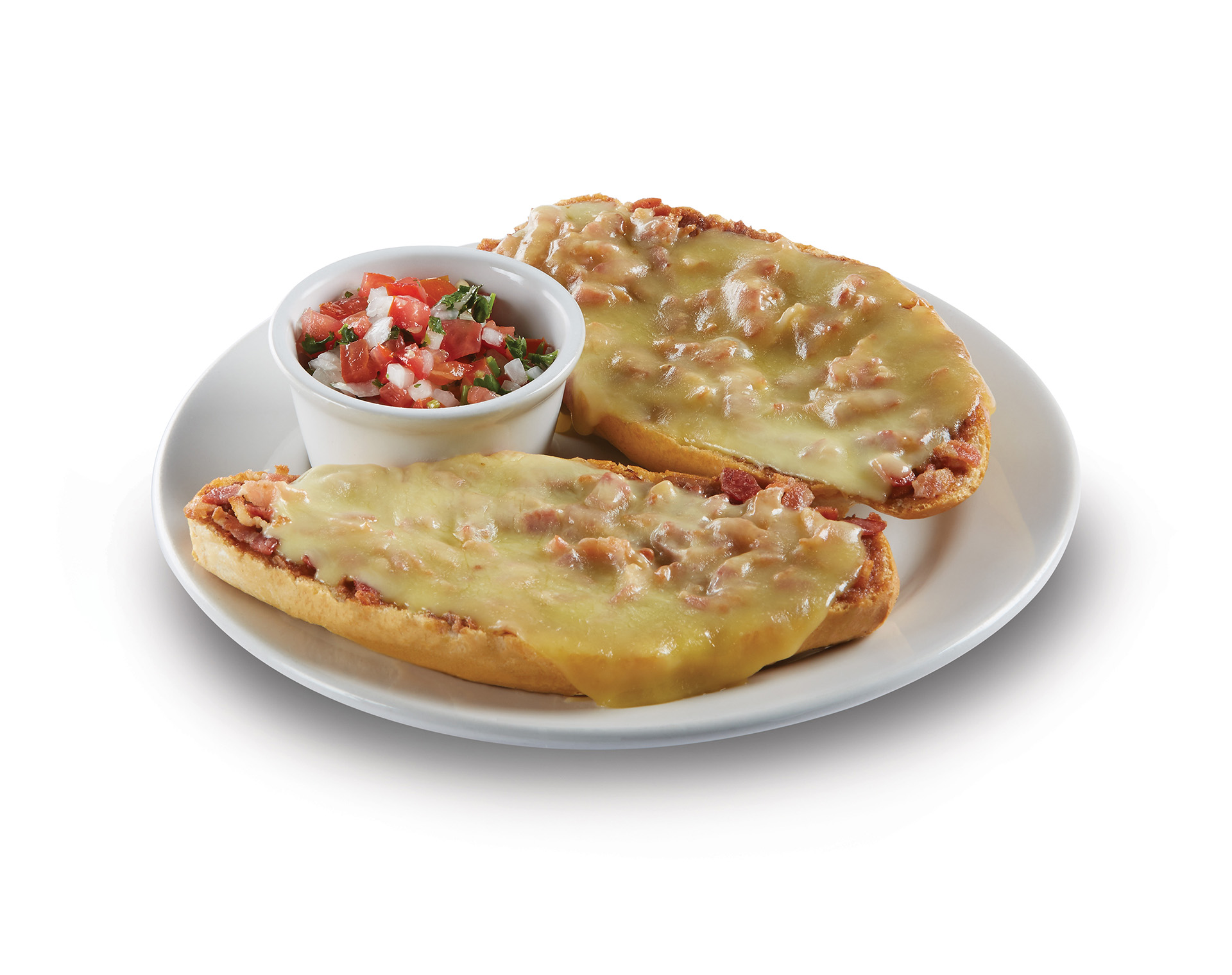 Dos piezas con frijoles refritos, queso gouda, tiras de milanesa de pollo y pico de gallo. Acompañados de papas gajo con queso parmesano