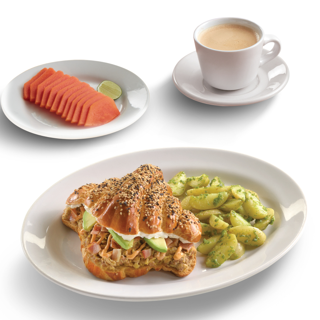 Croissant con queso crema, aderezo chipotle, aguacate y tocino; acompañado de papas cambray al pesto