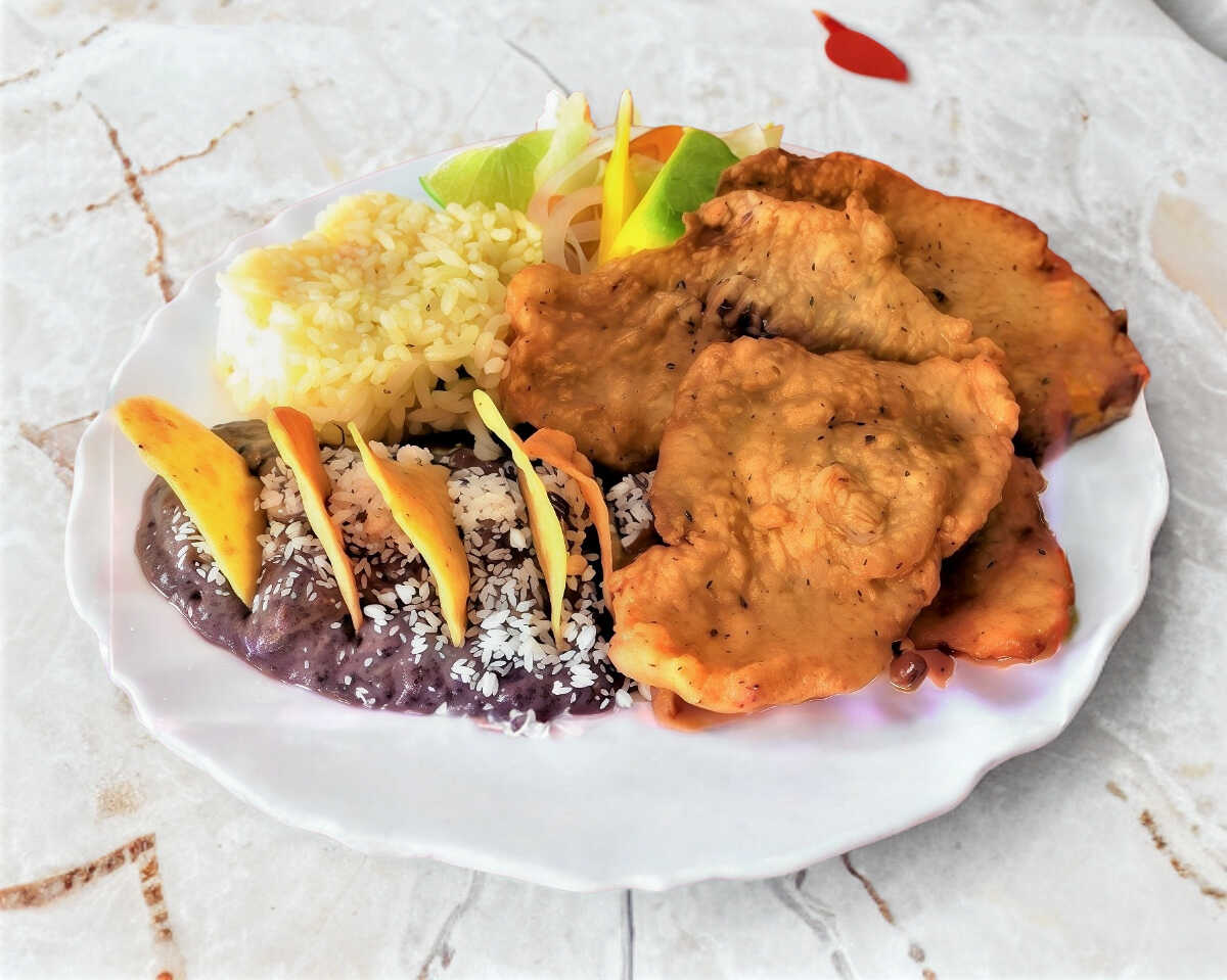 Filete de cerdo empanizado, acompañado de ensalada, arroz, frijoles, salsas y tortillas de maíz.