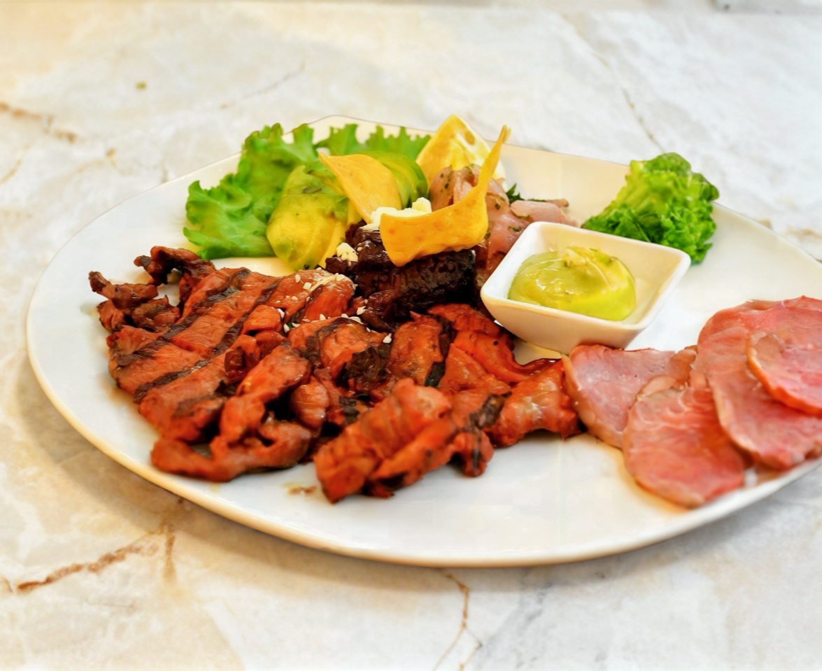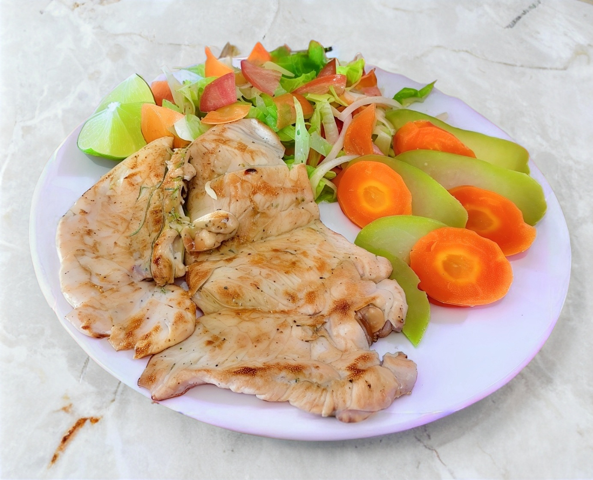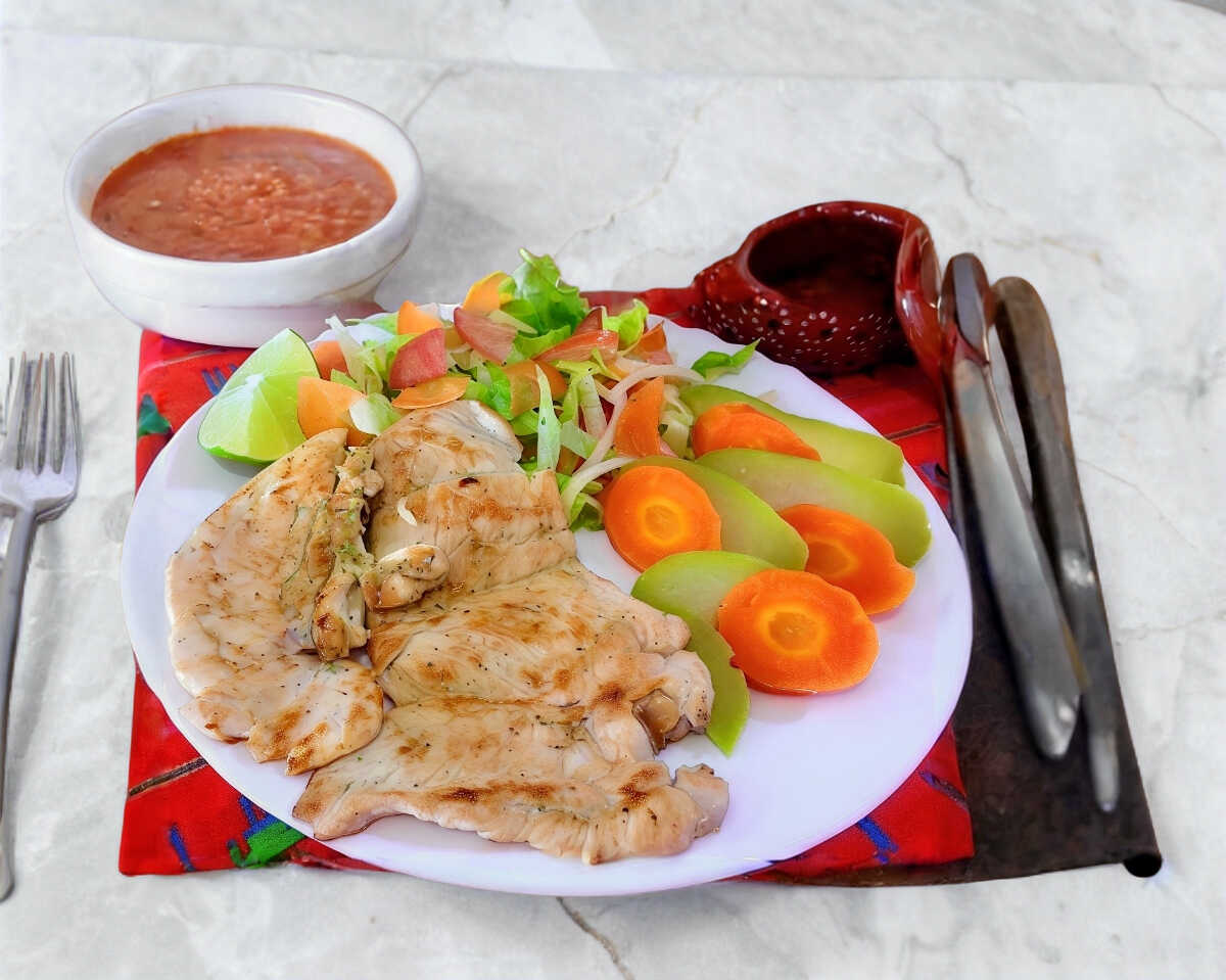 Filete de pechuga marinada a la plancha, acompañada de ensalada verde o verduras al vapor, arroz, frijoles, salsas y tortillas de maíz.