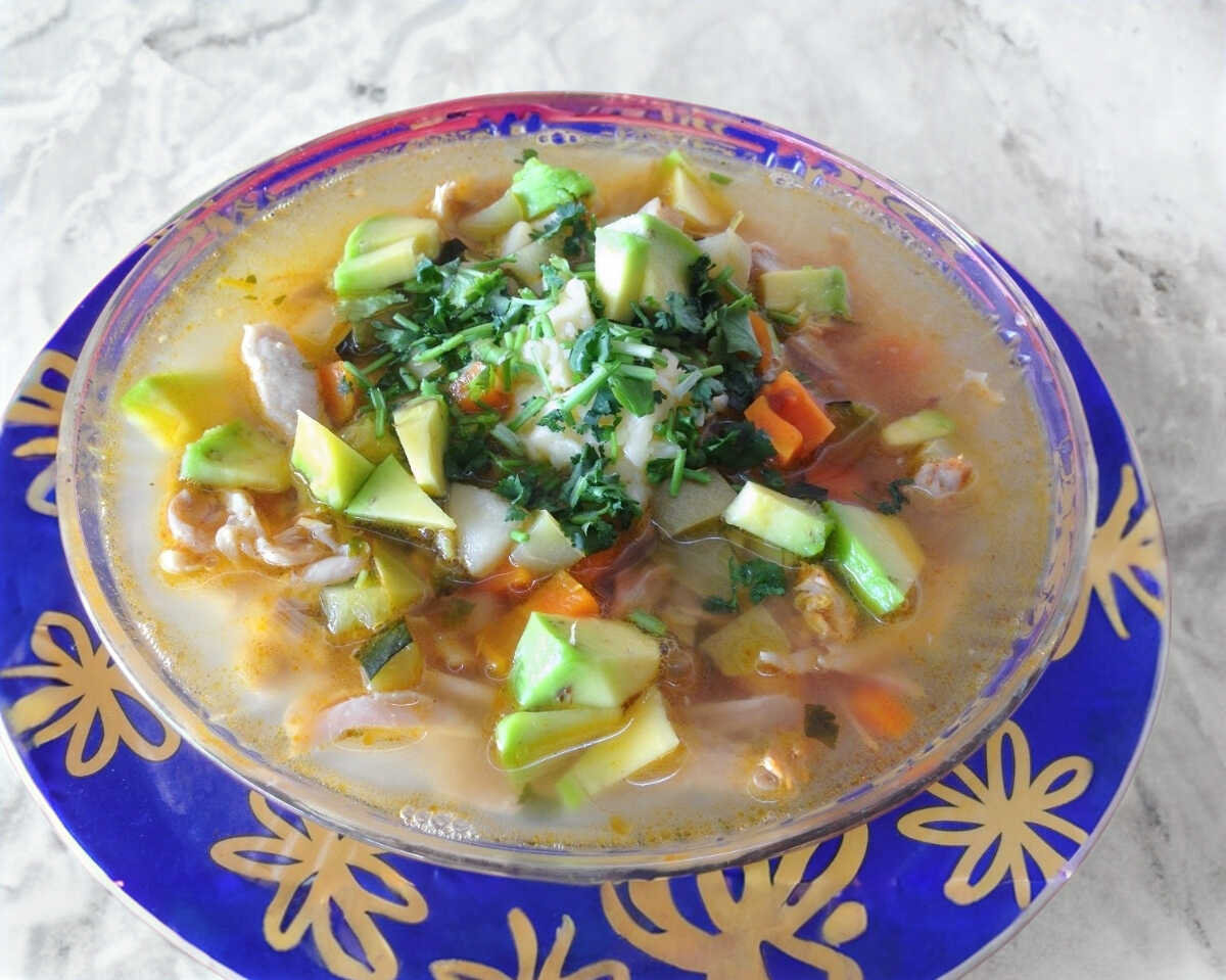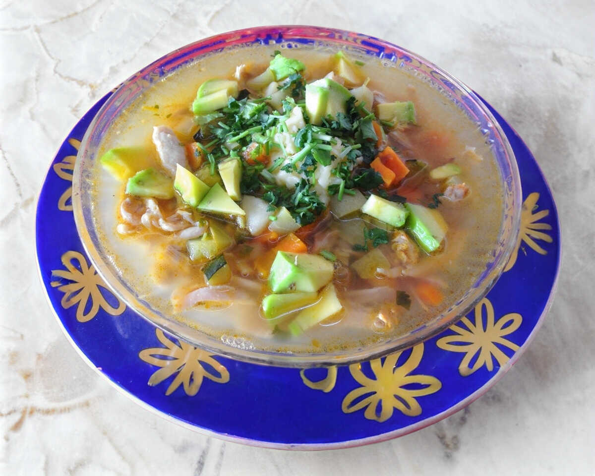 Aprox. 700 ml de riquísimo consomé de pollo (con pollo deshebrado), acompañado de arroz, limón, salsas y tortillas de maíz.