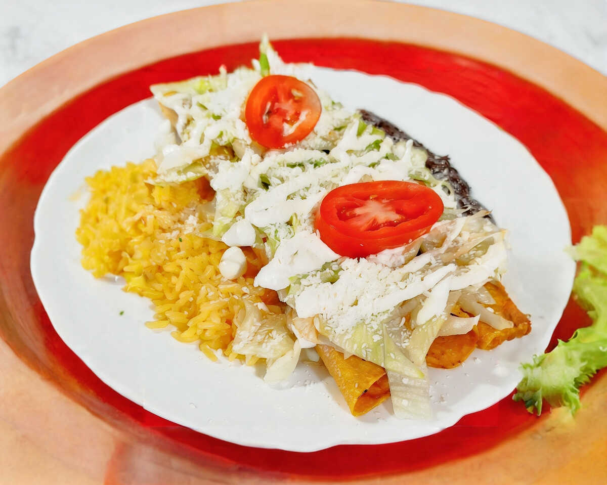 2 flautas dobles (12cm cada una), acompañadas de romanita, cebolla, queso, media crema, arroz y frijoles.