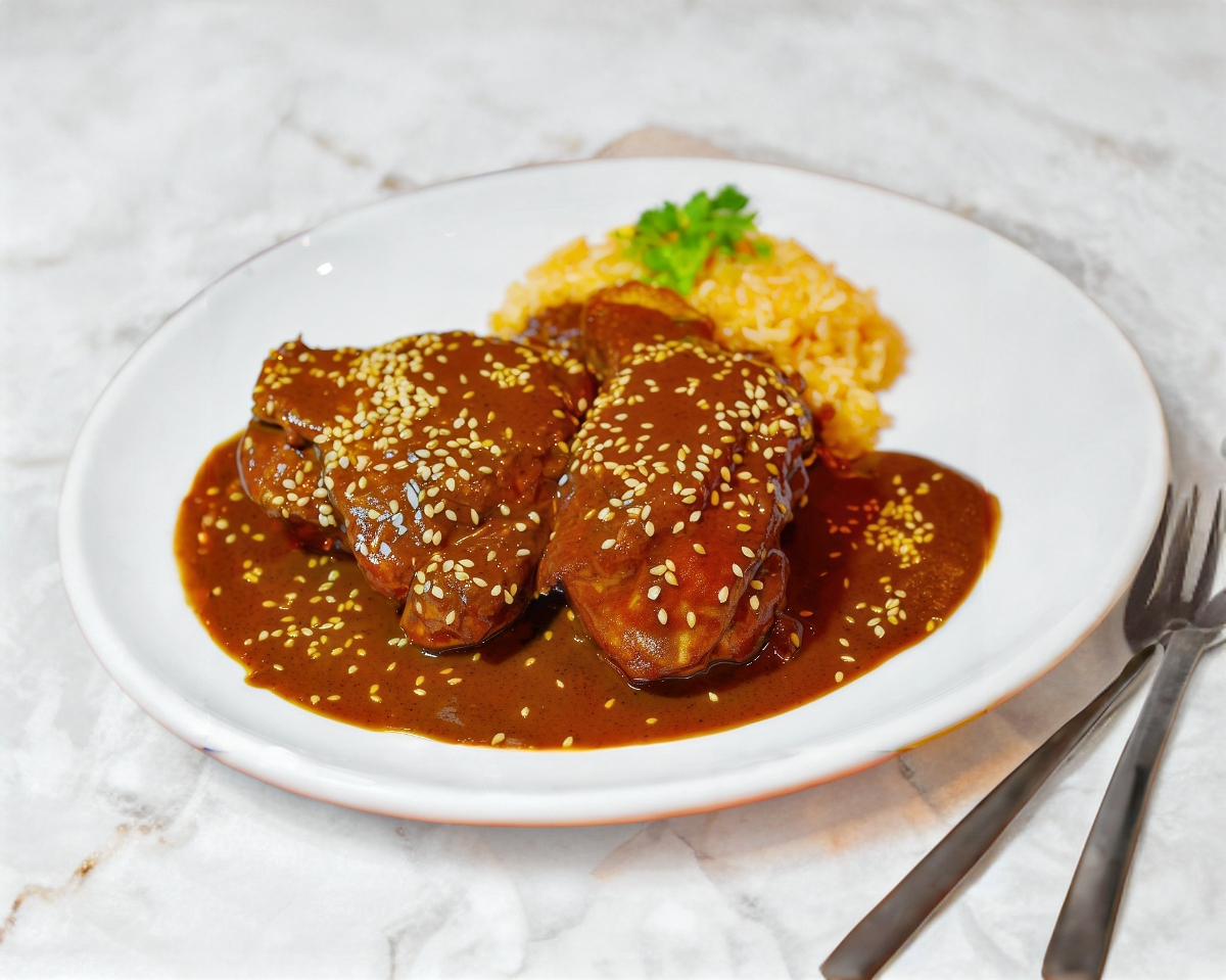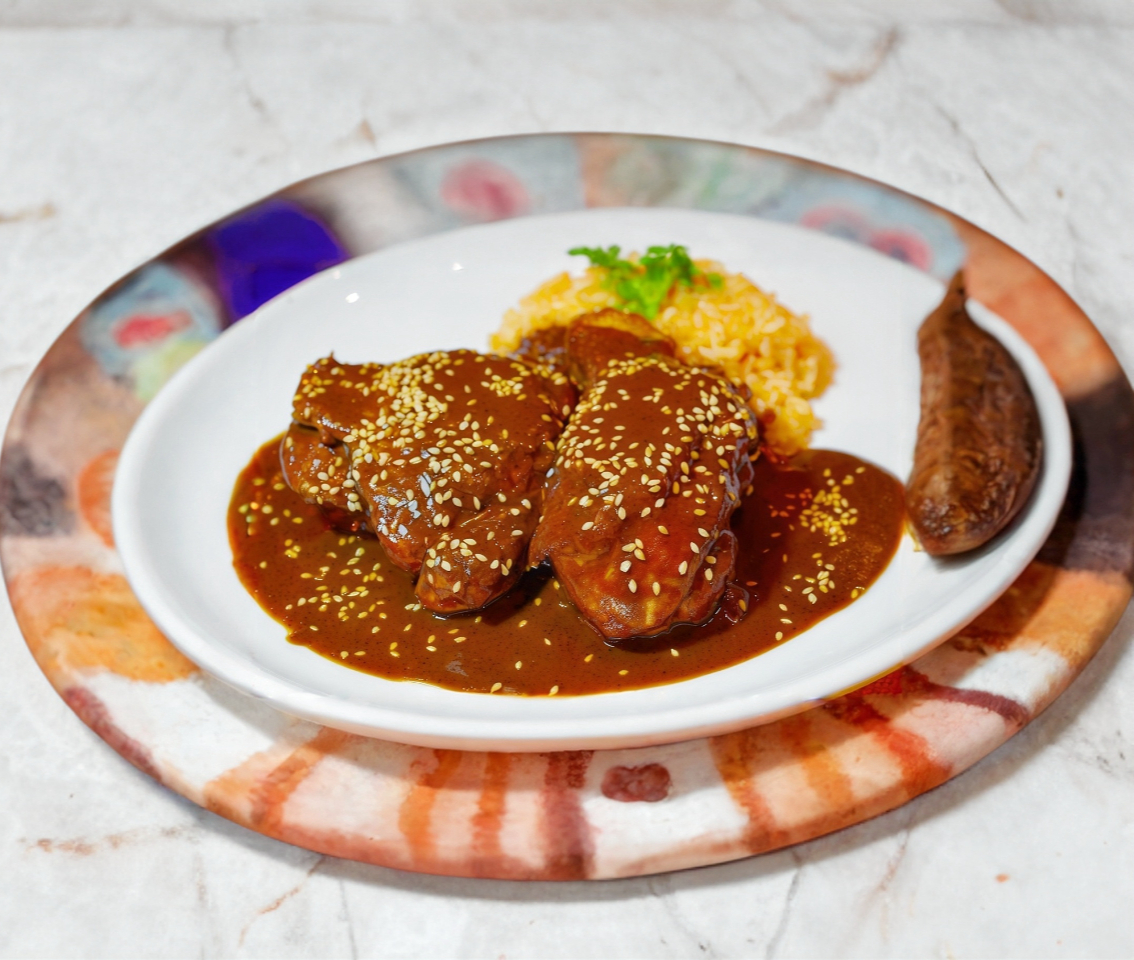 Auténtico mole poblano, acompañado de arroz y tortillas de maíz.
