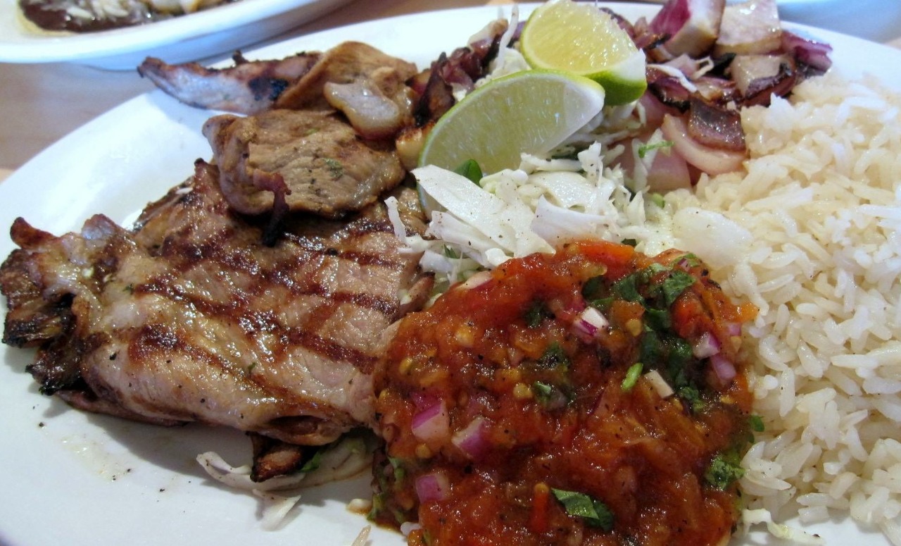 Puerco asado Poc-Chuc (media orden, 250 g) acompañado de arroz.