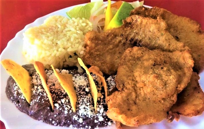Filete de pescado empanizado (crujiente o suave), acompañado de ensalada verde, arroz, frijoles, salsas y tortillas de maíz.