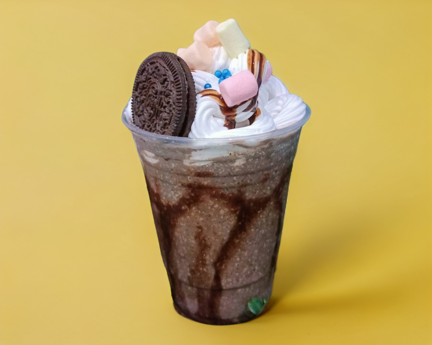 batido de leche con galletas oreo acompañado de crema batida decorado con malvavisco y hershey