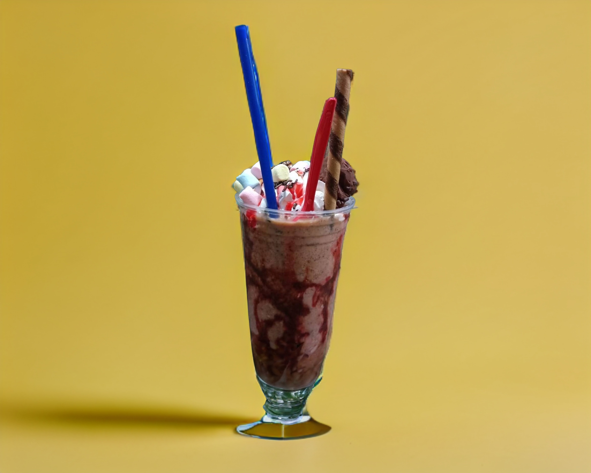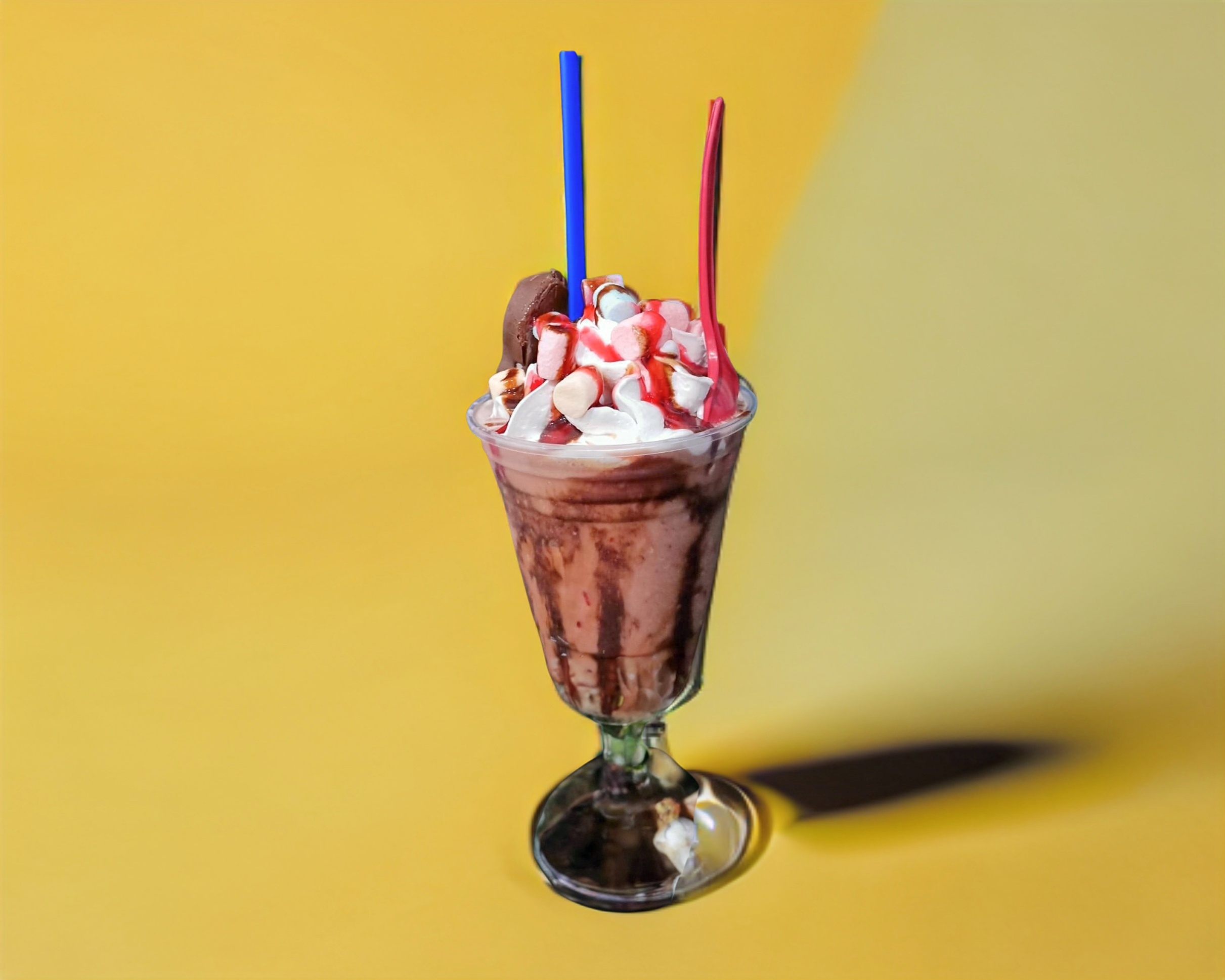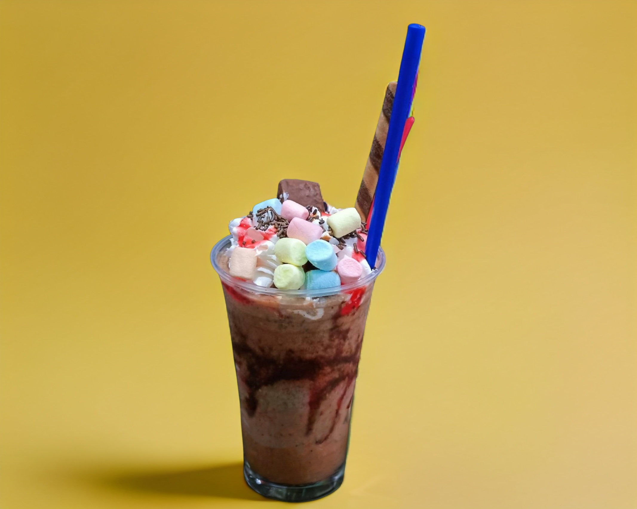 batido de leche con mamut acompañado de crema batida decorado con malvavisco y hershey