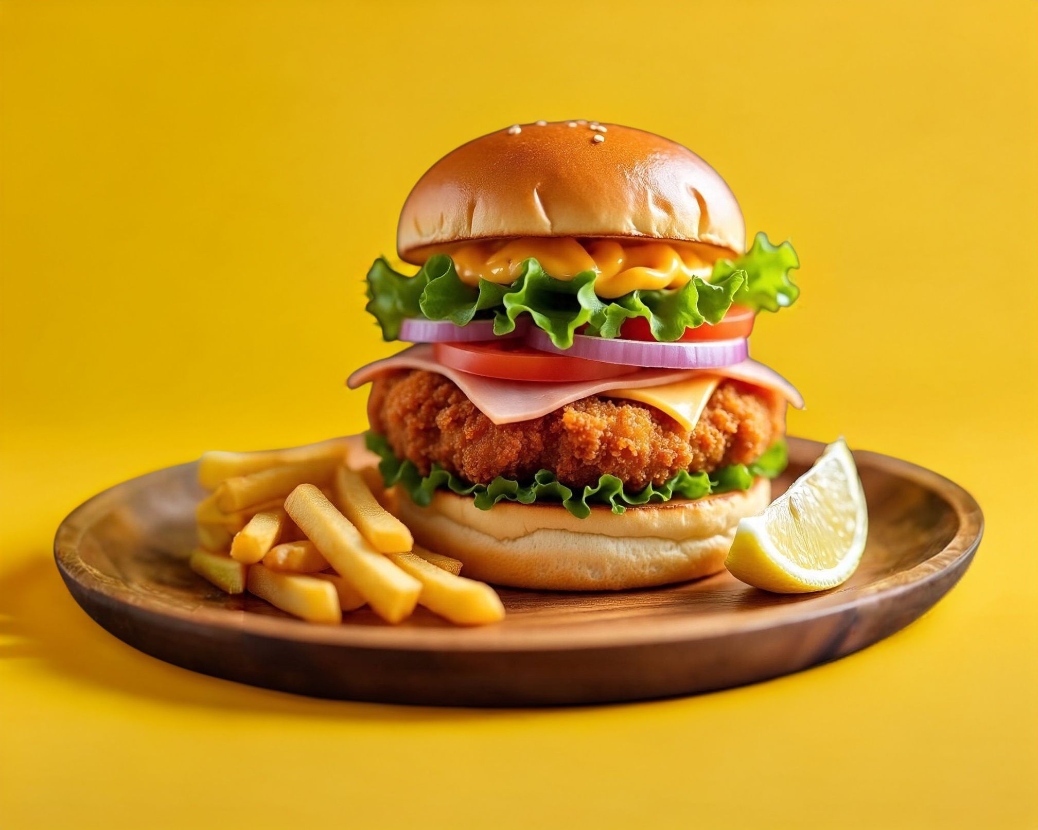 Hamburguesa de pollo empanizado, crujiente por fuera y jugosa por dentro, acompañada de lechuga, tomate, queso, cebolla y jamón, con un toque de catsup.