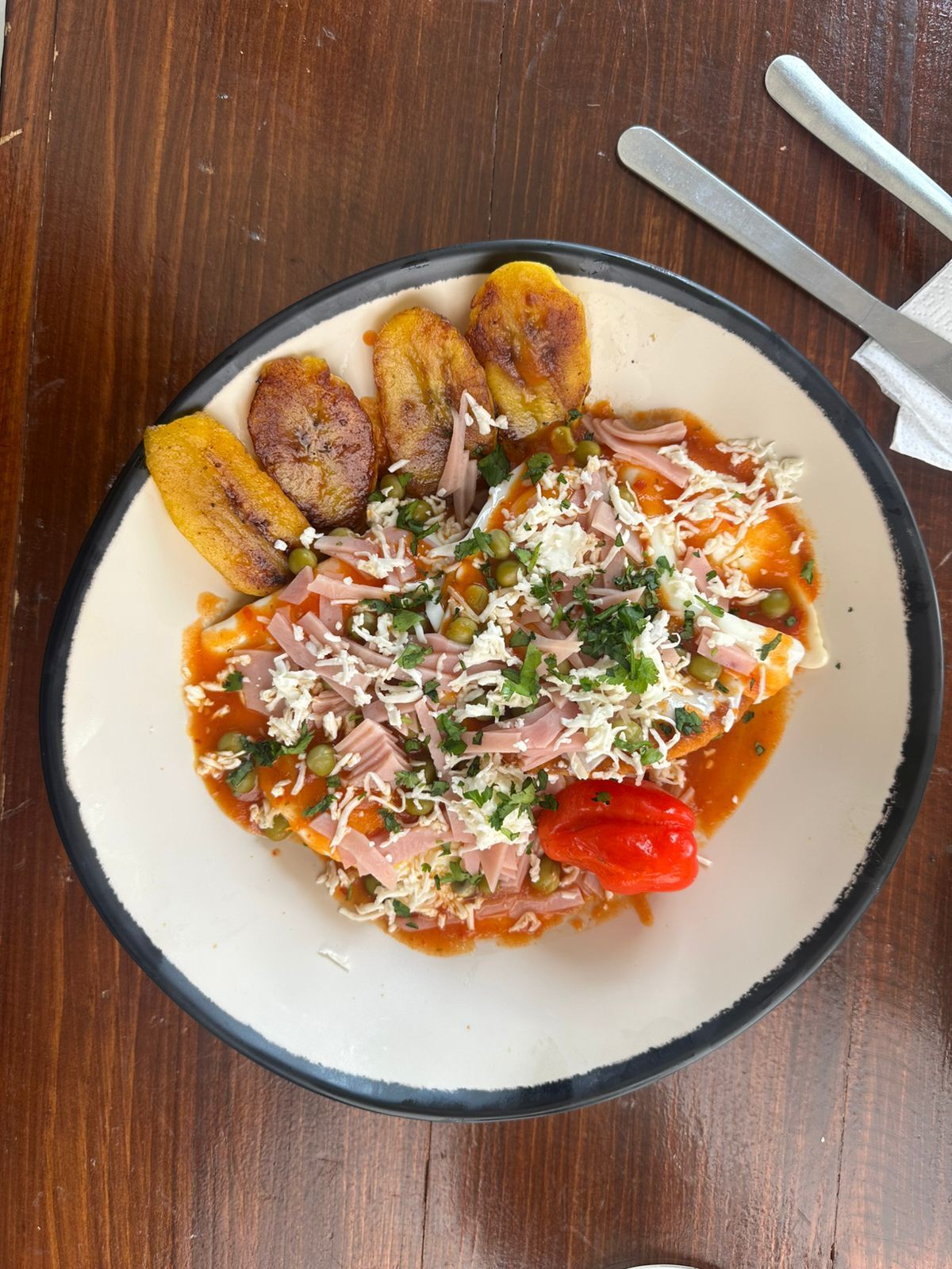 Huevos estrellados sobre tostadas crujientes, bañados en salsa de tomate con jamón y chícharos. Coronados con plátano frito y sobre una cama de frijoles refritos.