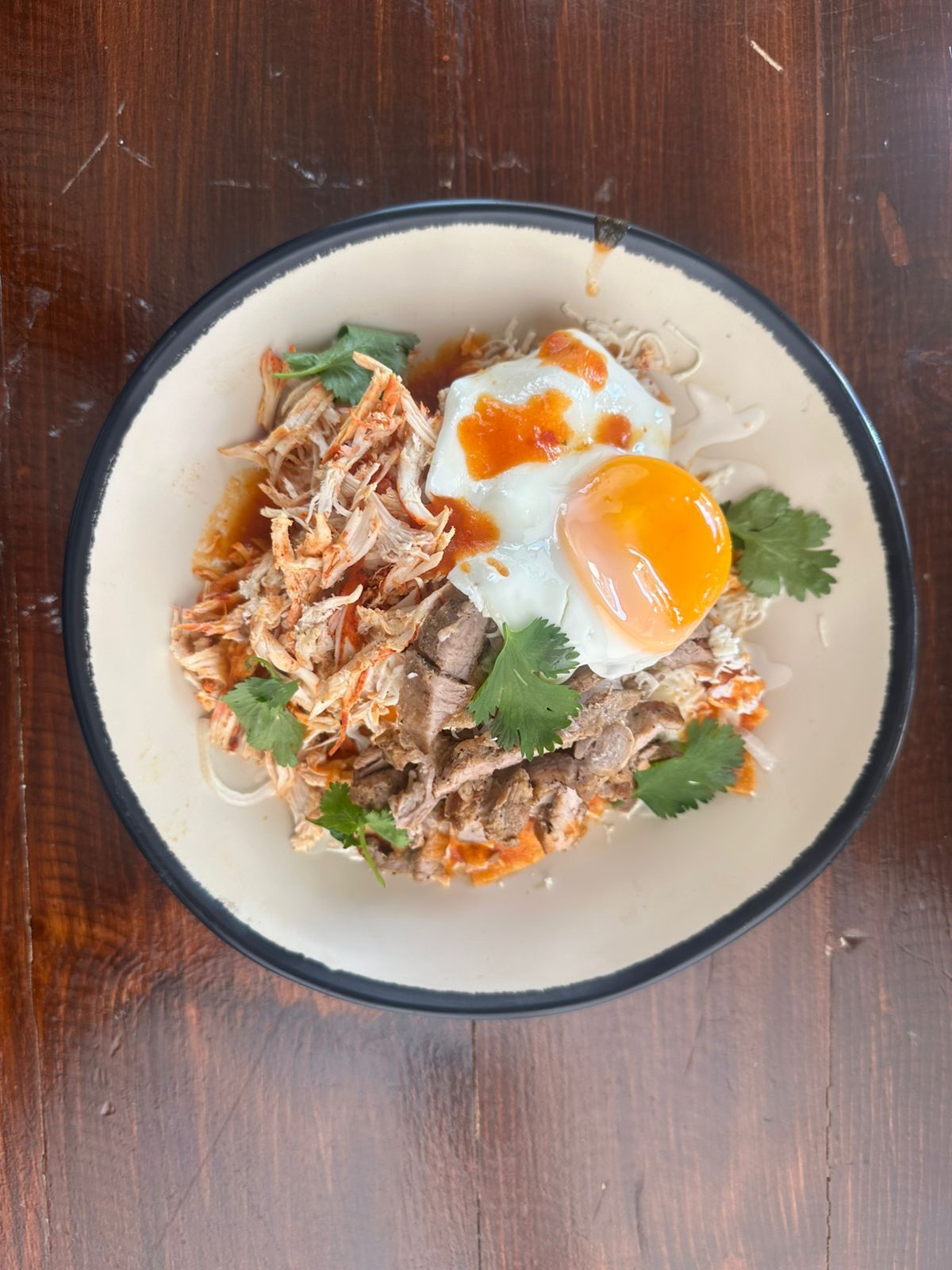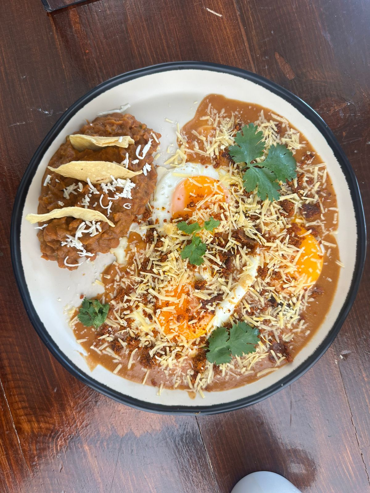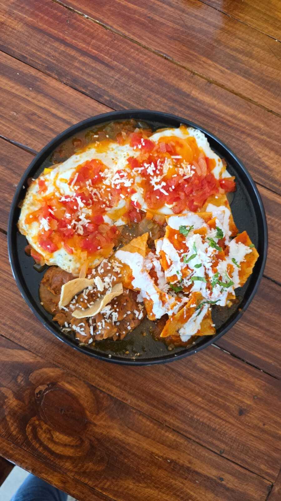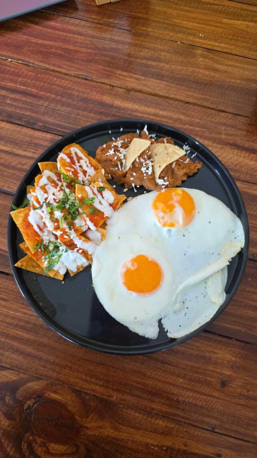 Huevos estrellados sobre tortillas de maíz, bañados en una salsa roja. Acompañados con frijoles refritos y totopos crujientes.