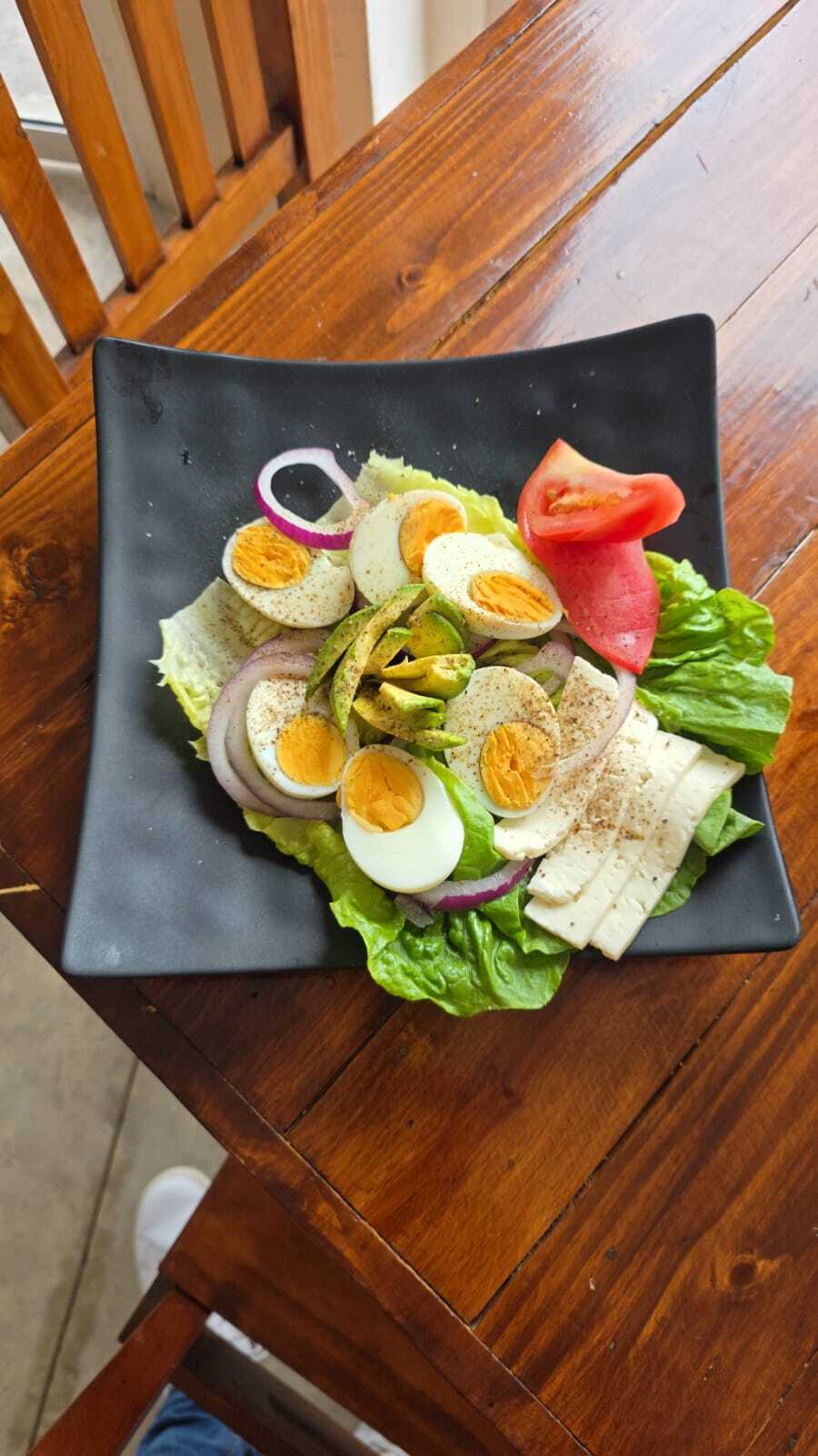 Mezcla fresca de lechuga, tomate, acompañada con rebanadas de huevo cocido y cubos de queso panela.